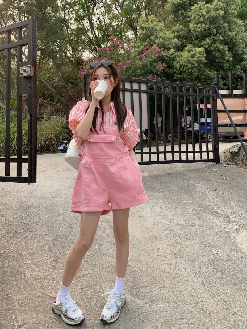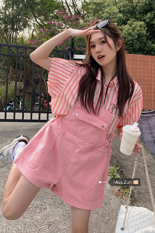 ピンクデニムオーバーオールショートパンツ女性バージョンゆったりとした2023年夏新しいデザインセンスの小さなワイドレッグパンツ サマー 夏物 ショーツ ブルマー 8571630364628890