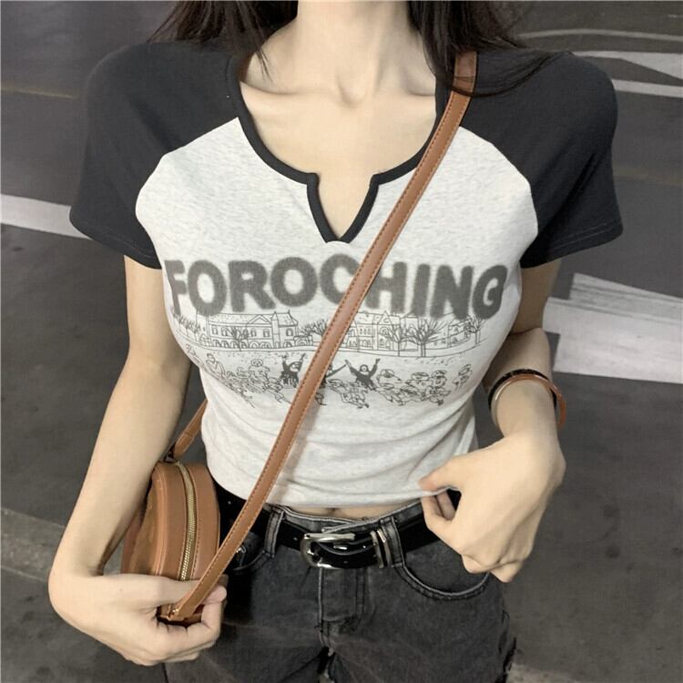 アメリカンレトロ半袖Tシャツレディースデザインセンスニッチ夏シック甘辛ハイウエスト露出へそスリムショートトップス ハイウェスト 大人ガーリー スウィート キュート カジュアル サマー 夏物 8571682073290421