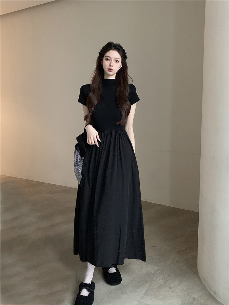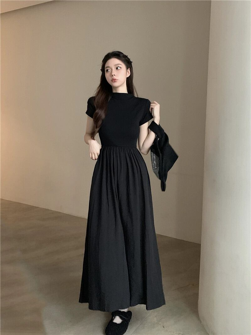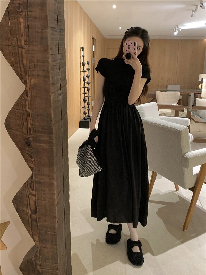 黒半袖ドレスの女性の夏フレンチヘップバーンスタイルリトルブラックドレス気質ハイエンド感覚ウエスト痩身ロングスカート サマー 夏物 857166525619160