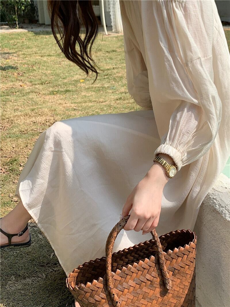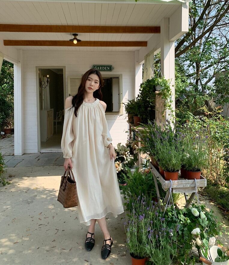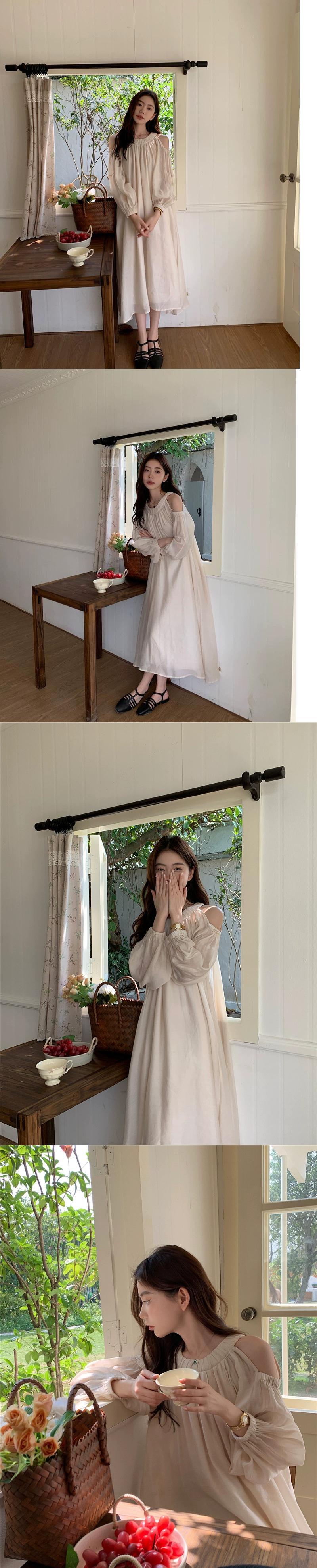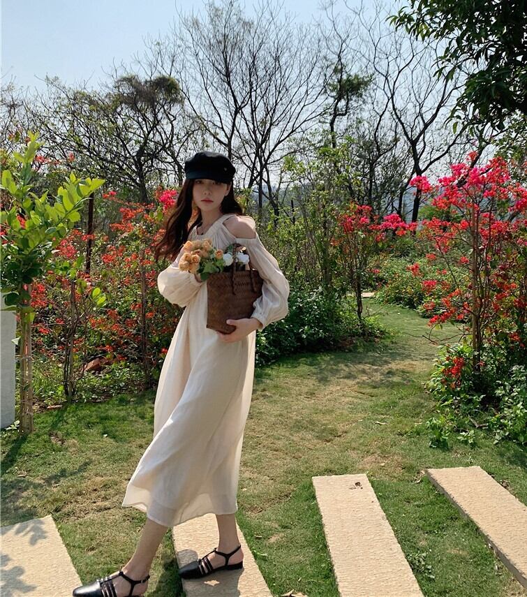 ミルキーアプリコットオフショルダードレスの女性 2023 初春の新しい穏やかな風ハイエンド気質スカートニッチなデザインセンス スプリング 春物 8571648946836322