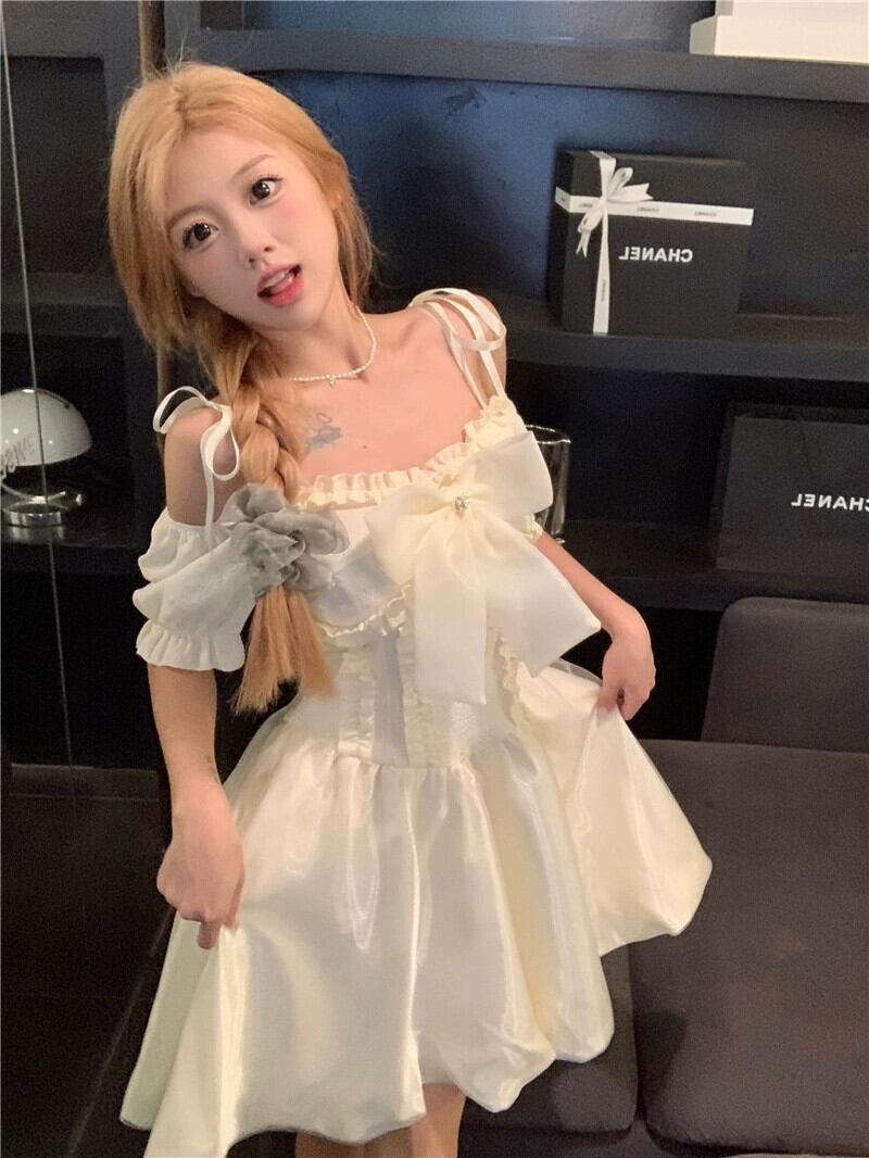 アプリコットワンショルダードレス女性小男性夏2023新しい純粋な欲望の弓ウエストショートスカート リボン サマー 夏物 ピュア 8571662279179054