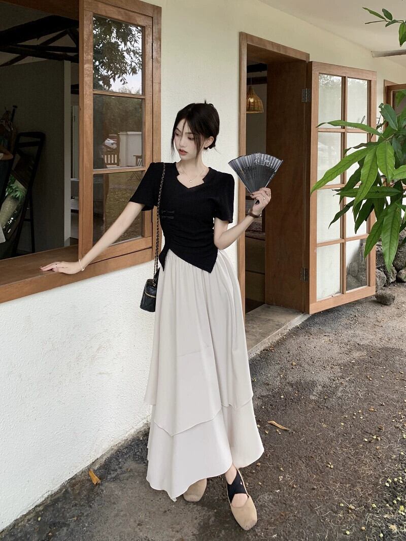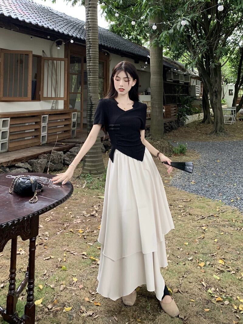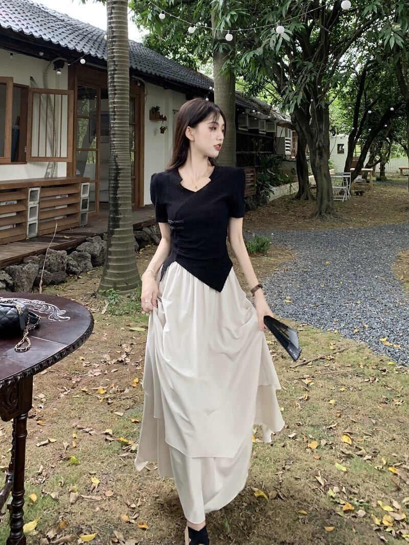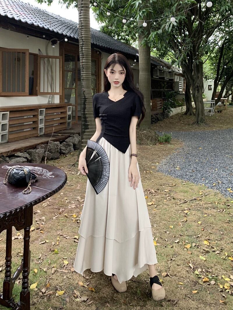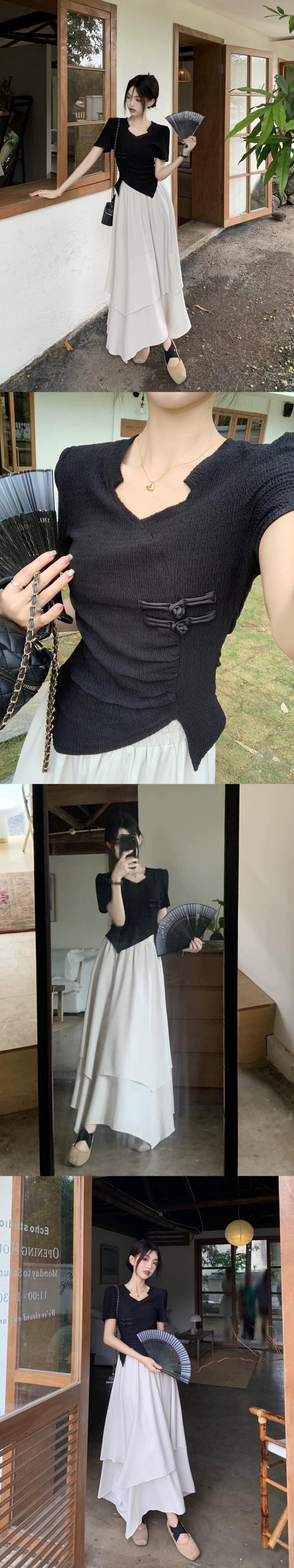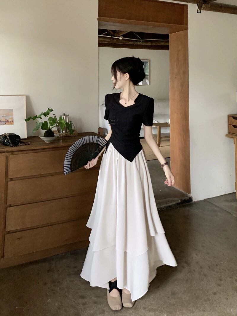 不規則なショートトップ女性の夏の新しい中国風ユニークな特別な甘い黒肩半袖 T シャツ ブラック 大人ガーリー スウィート キュート カジュアル サマー 夏物 Tシャツ 8571636232966664