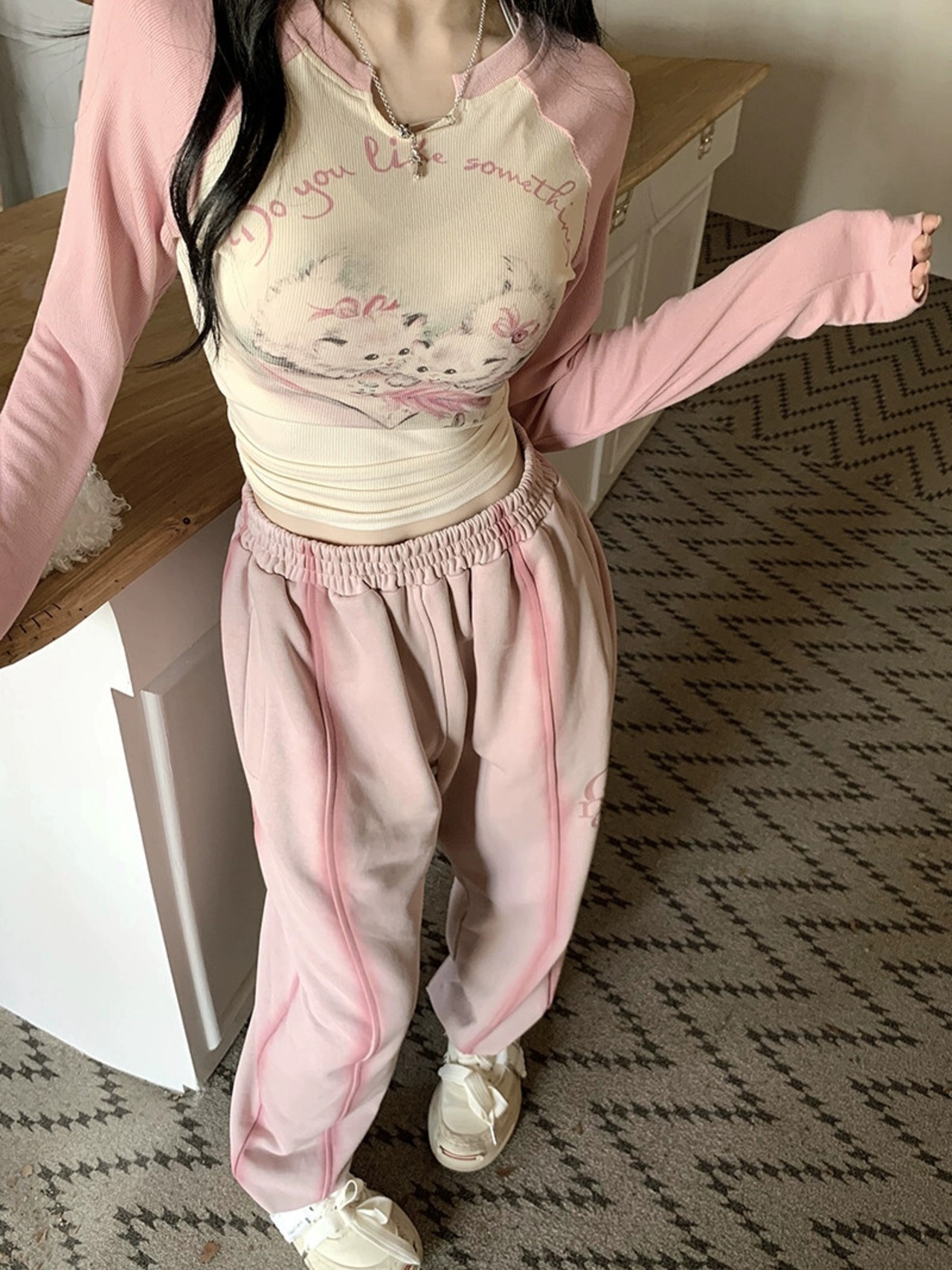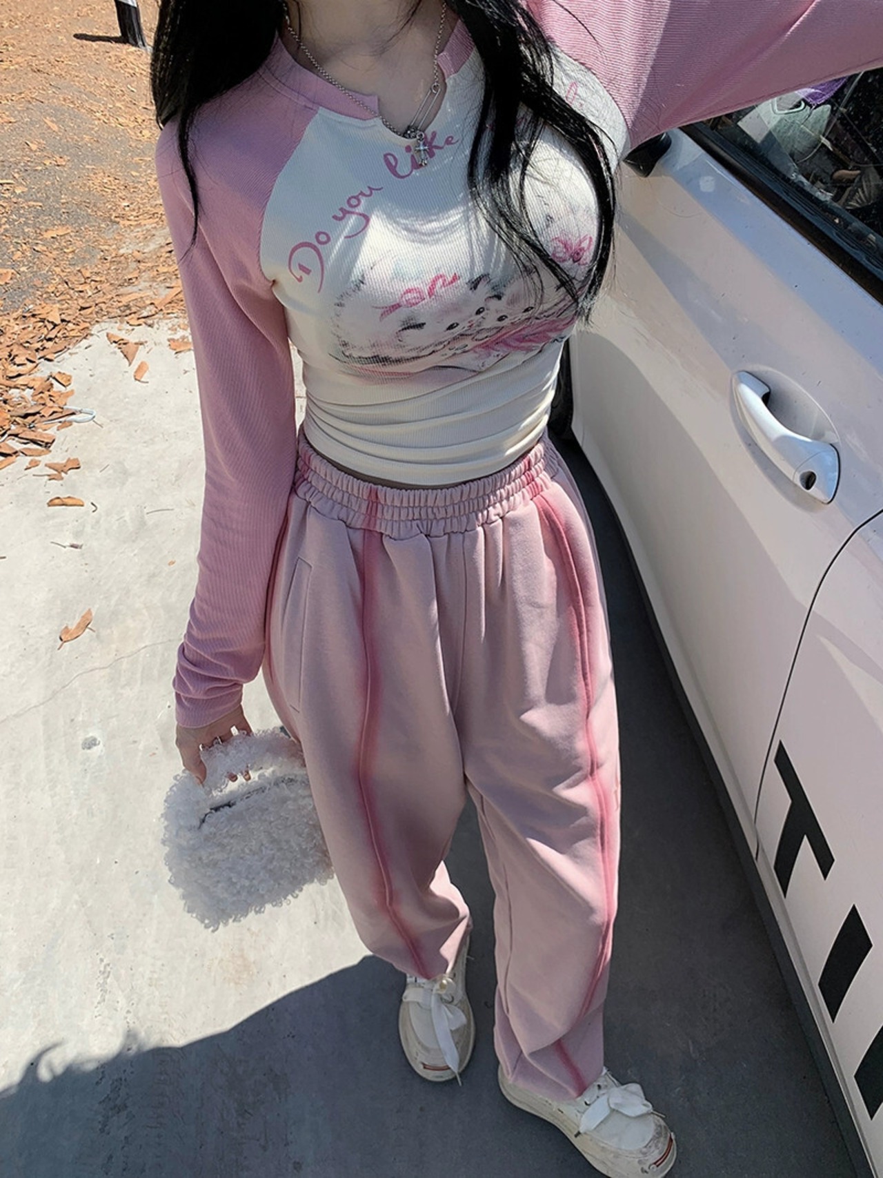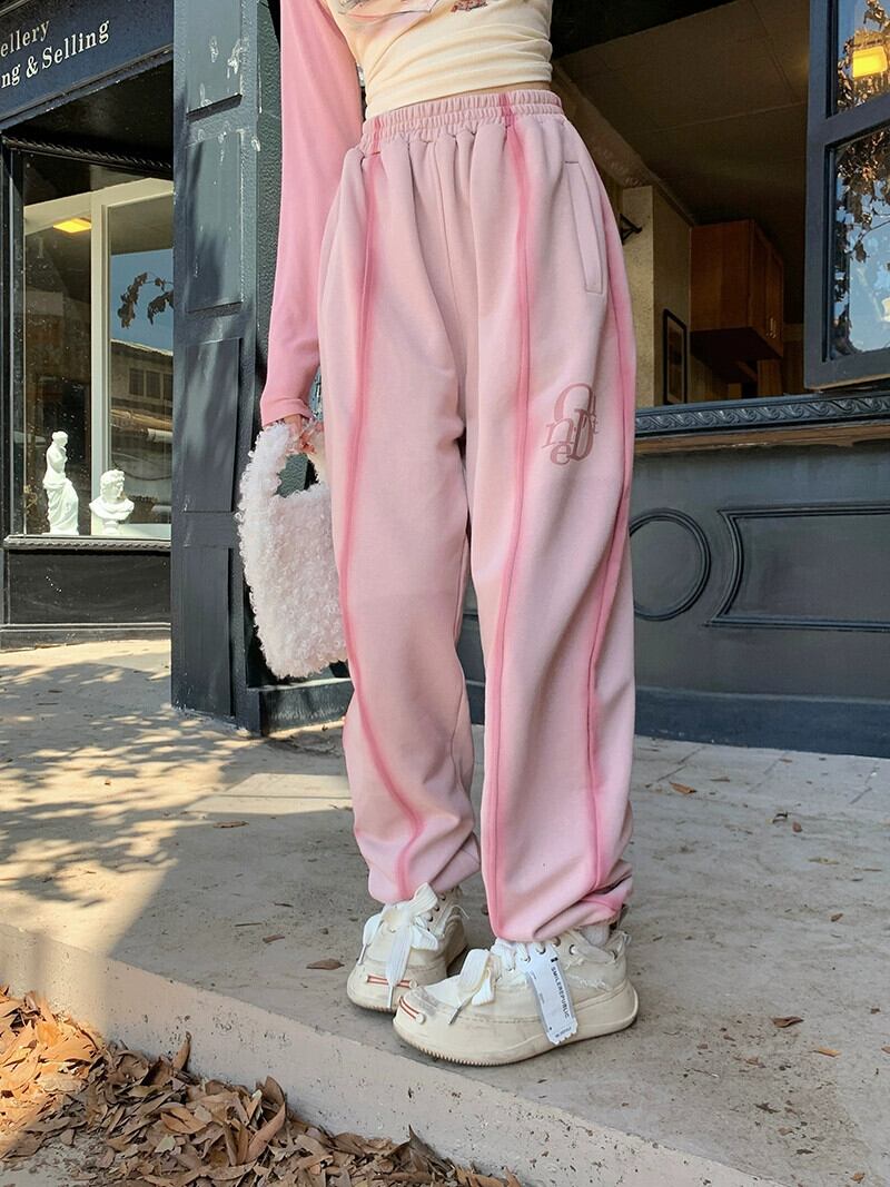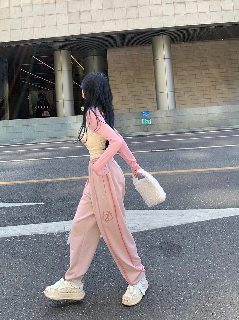 ピンクカジュアルスポーツパンツレディースルーズフィットパンツ2023春新デザインセンスニッチハイウエストハーレムパンツ スプリング 春物 8571615404314174