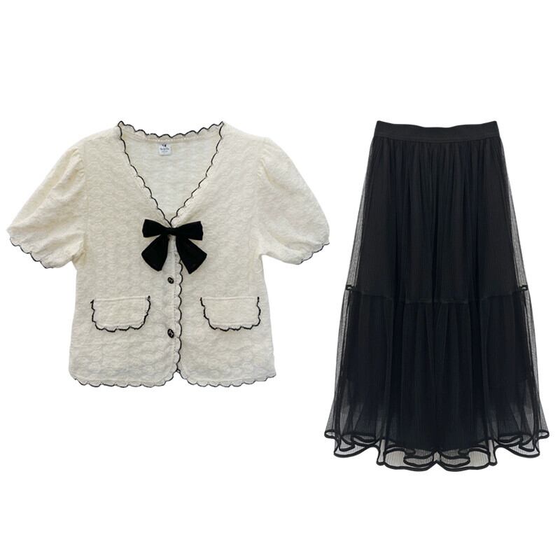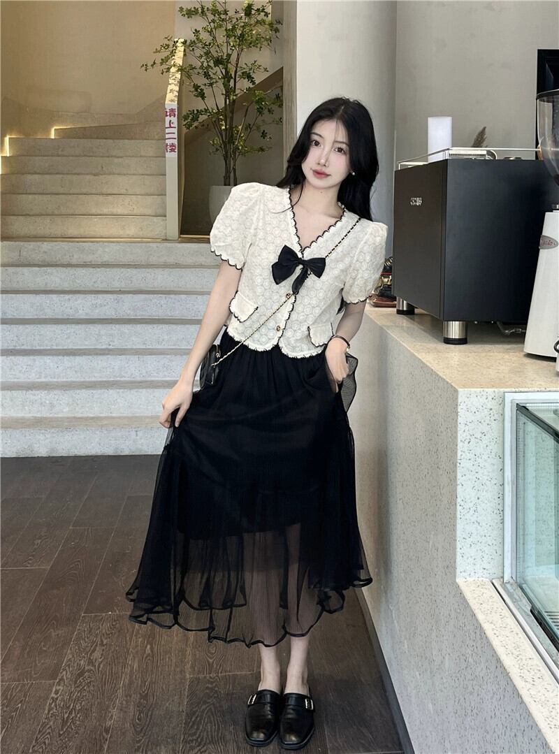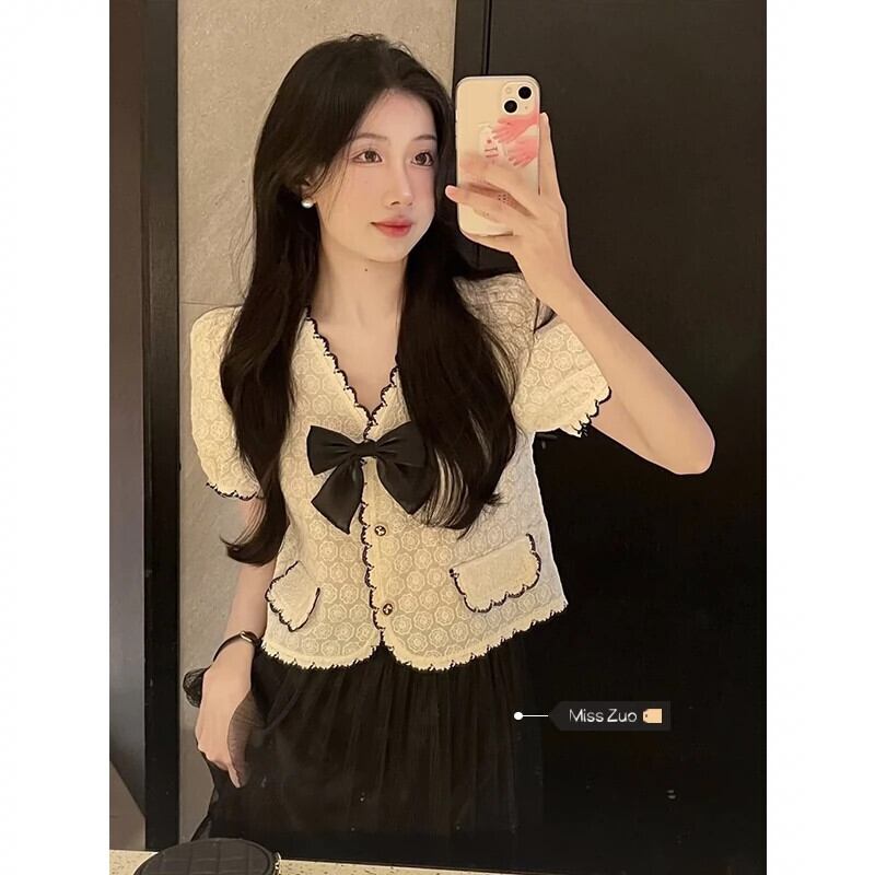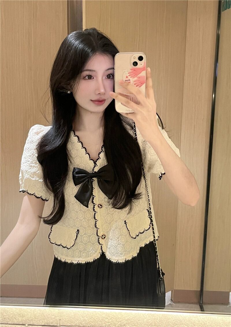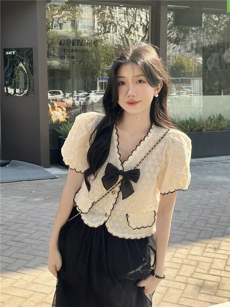 小さな香りの風ショートトップレディース夏デザインセンスニッチフランスの優しい気質Vネック半袖レースシャツ サマー 夏物 857167298749915