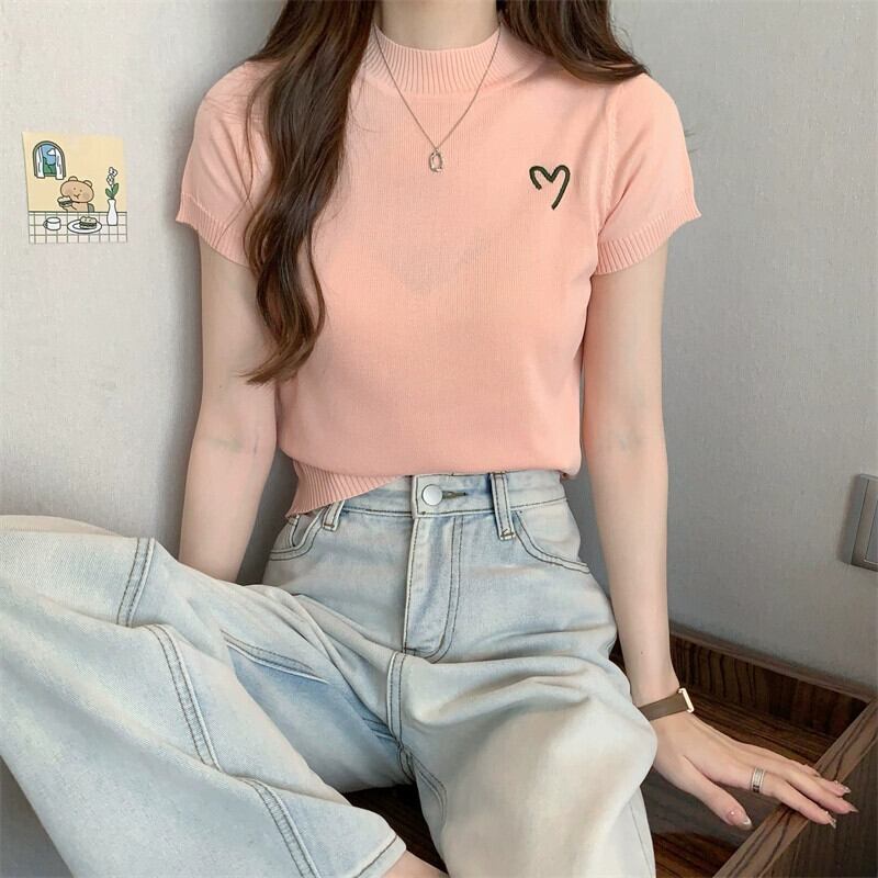ピンクニット半袖Tシャツレディース2023年夏新作シックシックシックスリムハーフハイカラーショートトップ サマー 夏物 8571666237388877
