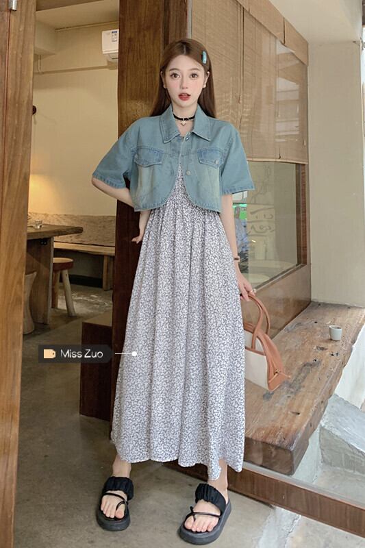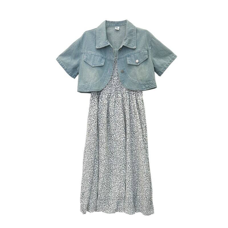 デニム半袖ジャケットレディースサスペンダースカート、2023年夏の新しいニッチでユニークなシックなショートトップ サマー 夏物 8571699801167556
