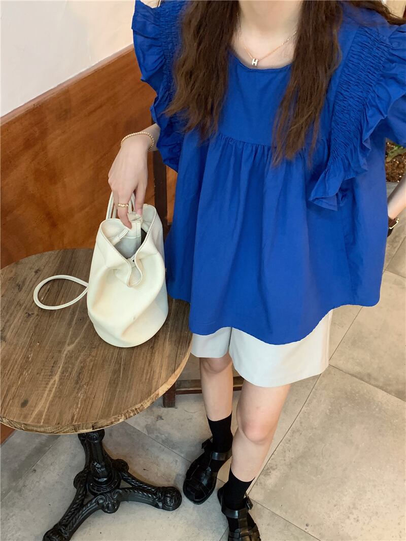 ドールシャツ フリルトップ レディース デザイン ニッチ感 夏 甘くて年齢を軽減する カバーベリーブルー パフスリーブシャツ 大人ガーリー スウィート キュート カジュアル サマー 夏物 857166048558225