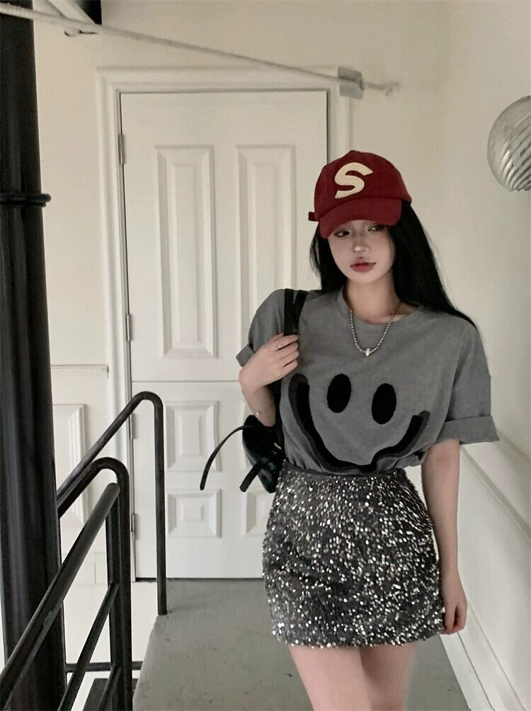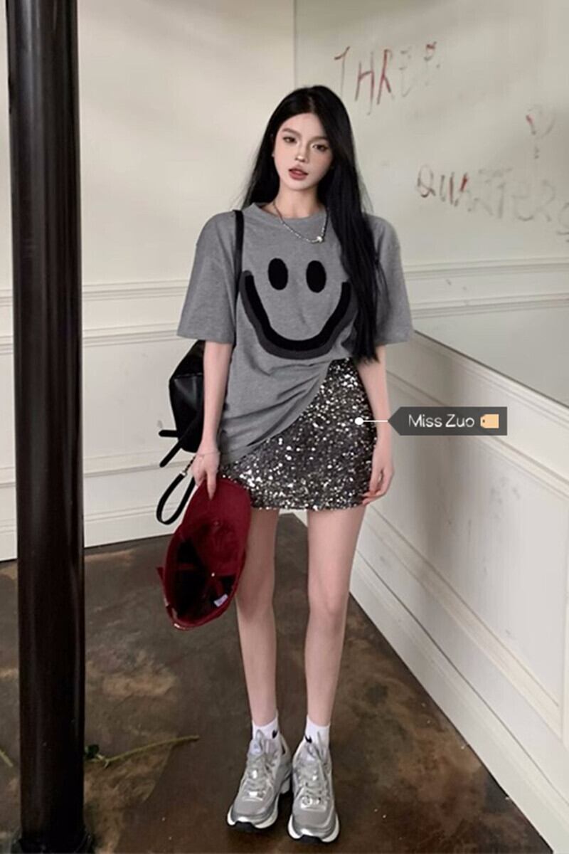 グレーの笑顔半袖 Tシャツレディース 2023 夏の新しいスタイルのデザインセンスニッチ香港風味シックなルーズトップ サマー 夏物 8571682719011157