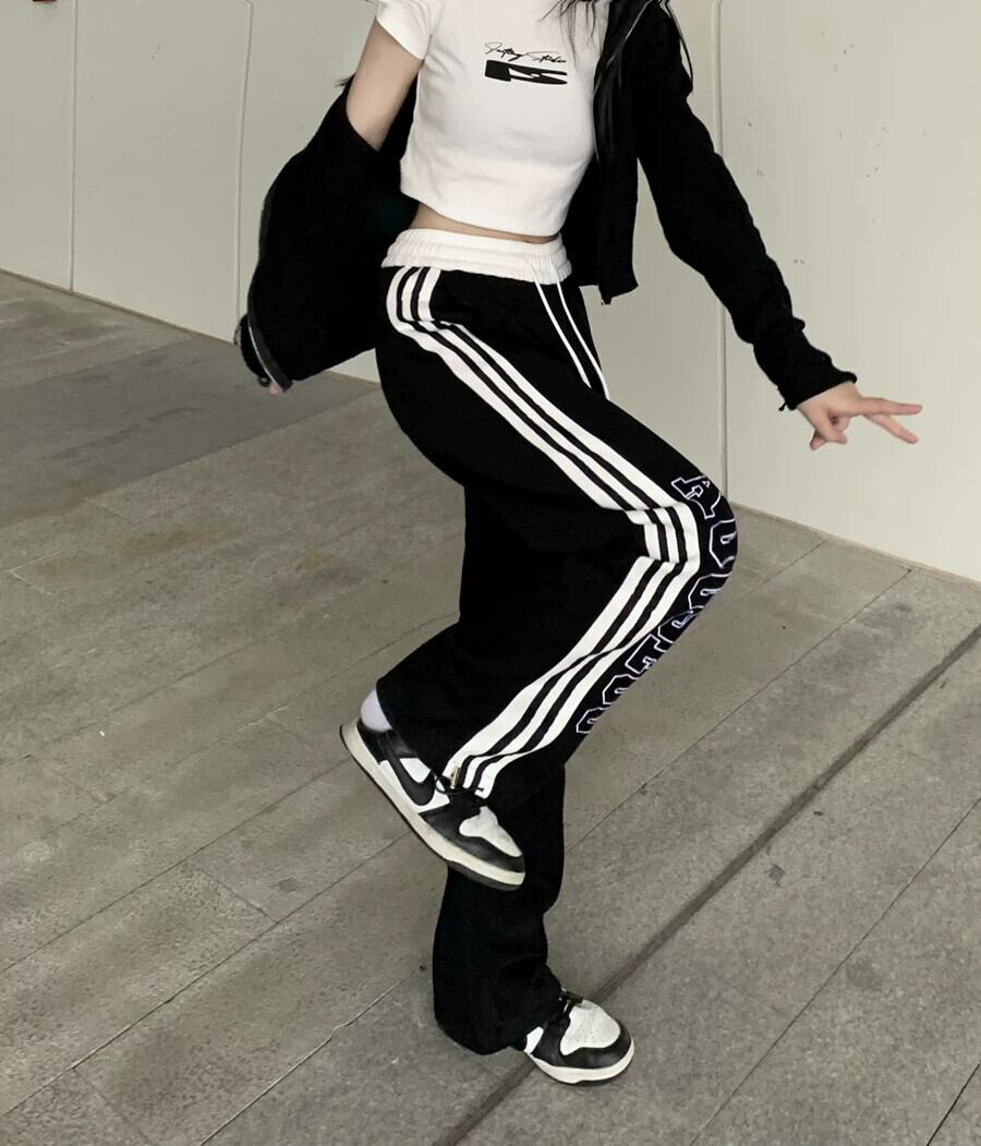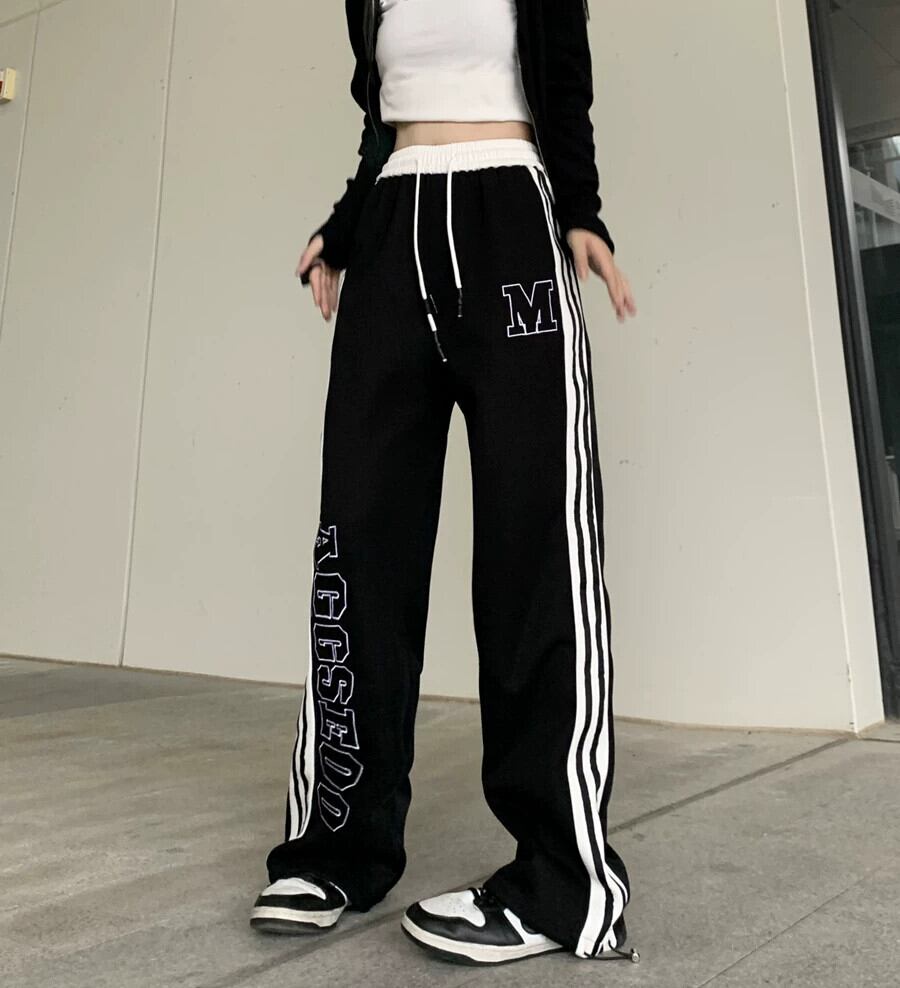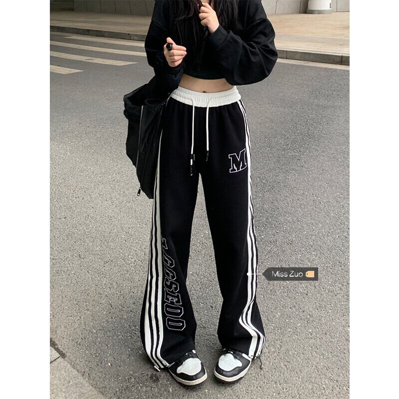 ブラックカジュアルスポーツパンツレディースアメリカンレトロハイストリートパンツ2023春新しいストレートレッグモップワイドレッグパンツ スプリング 春物 8571613075903440