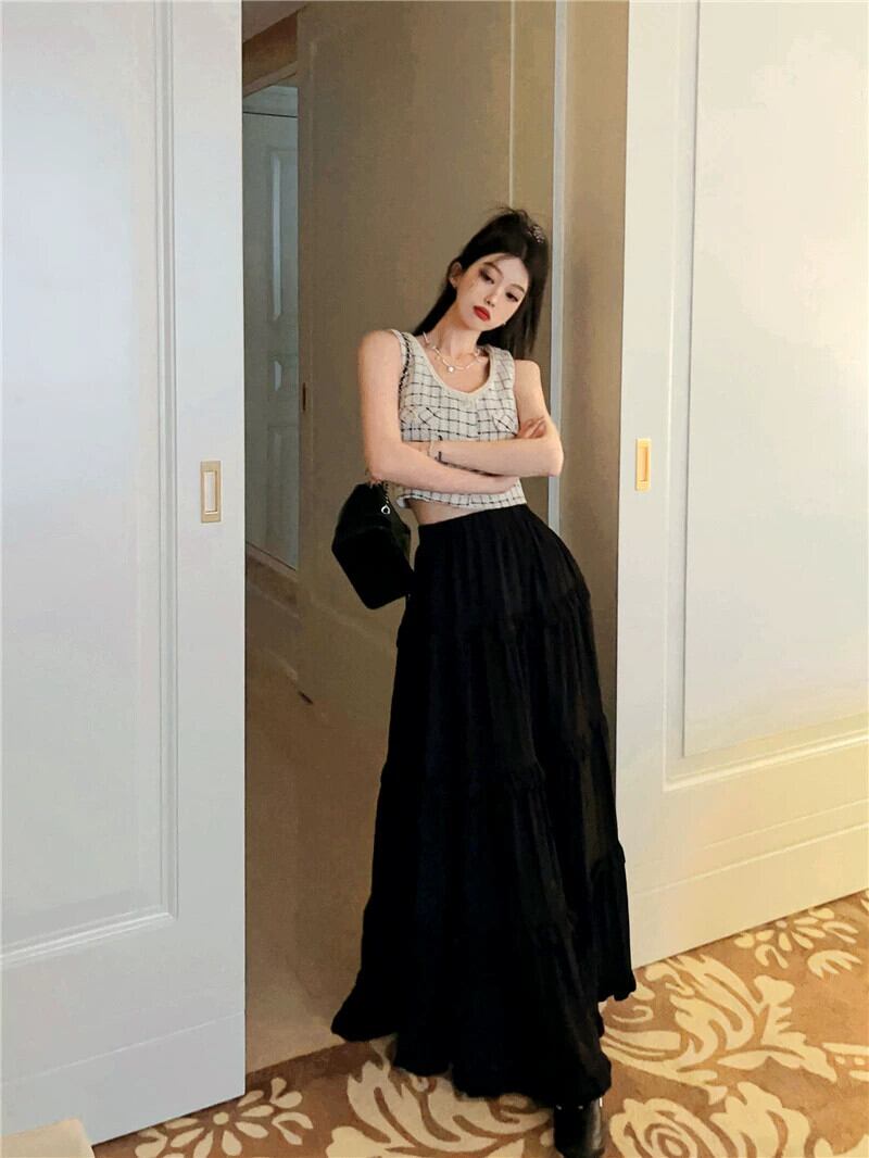 黒洋梨形フィギュアスカート女性小男性2023夏新デザインセンスニッチミドルロングスカート ブラック サマー 夏物 8571672265904819