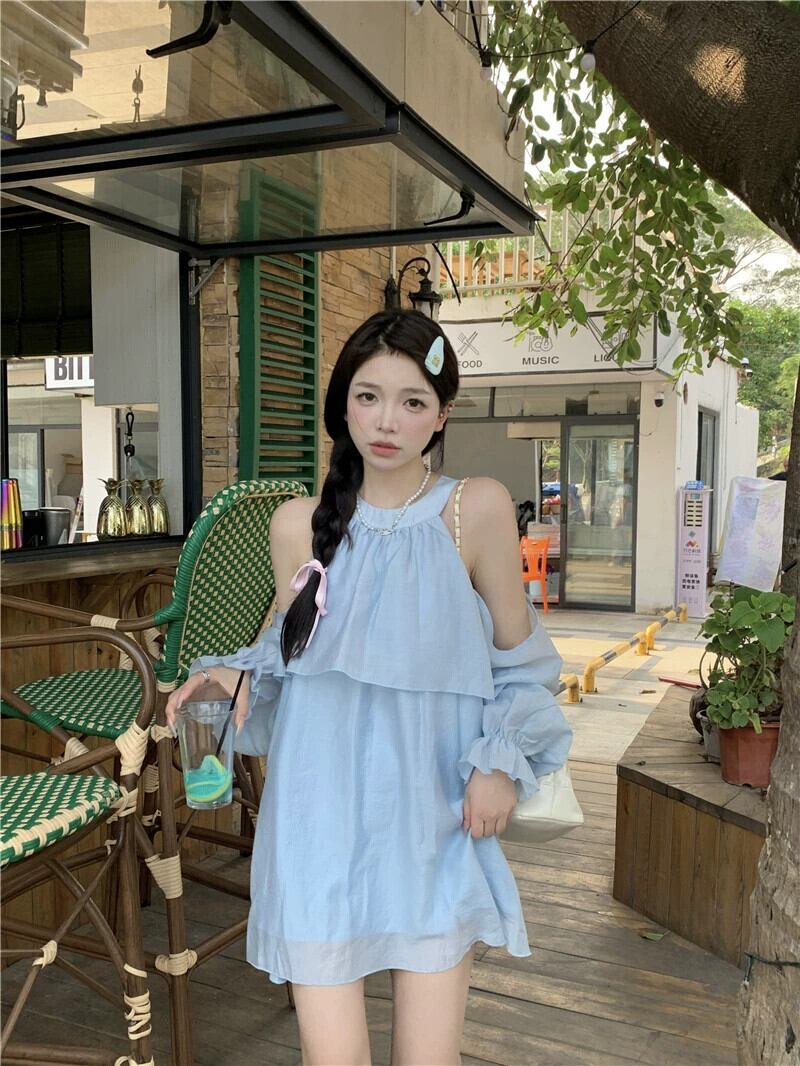 ブルーのオフショルダードレスの女性の夏のニッチデザイン、優しい風感、シックで美しい小さな短いスカートスーツ ショート サマー 夏物 8571669525207476