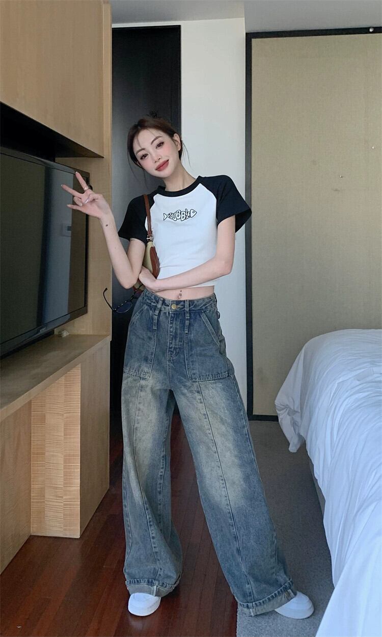 ブルーワイドレッグジーンズレディースルーズストレートモップパンツ夏2023新しいアメリカンレトロ小さなパンツ サマー 夏物 8571615233379483