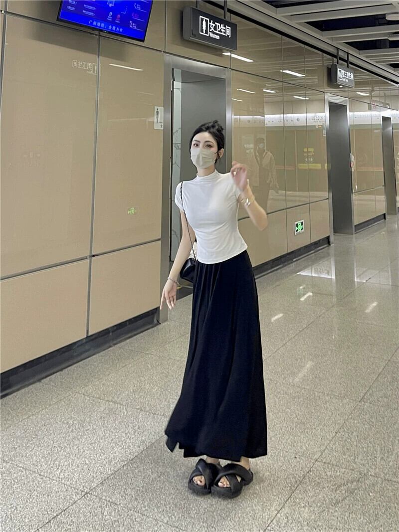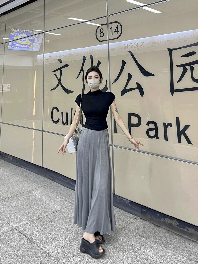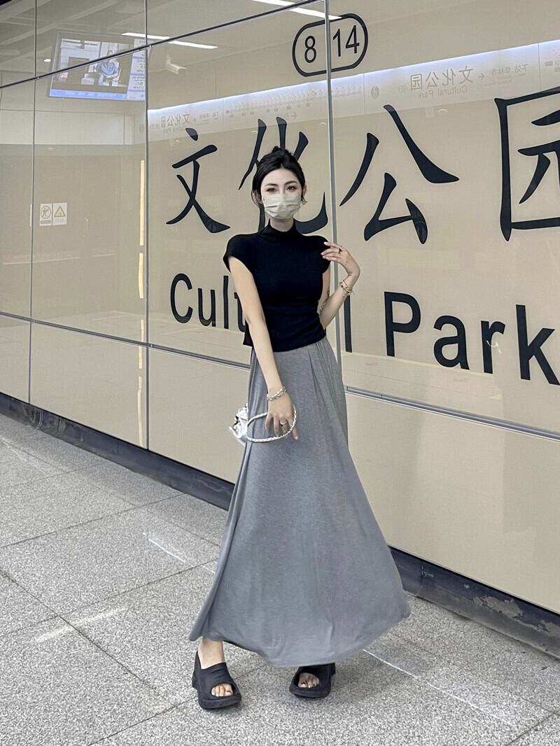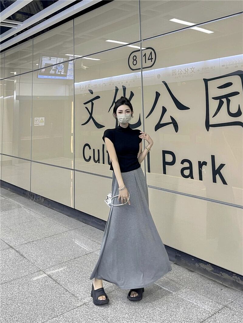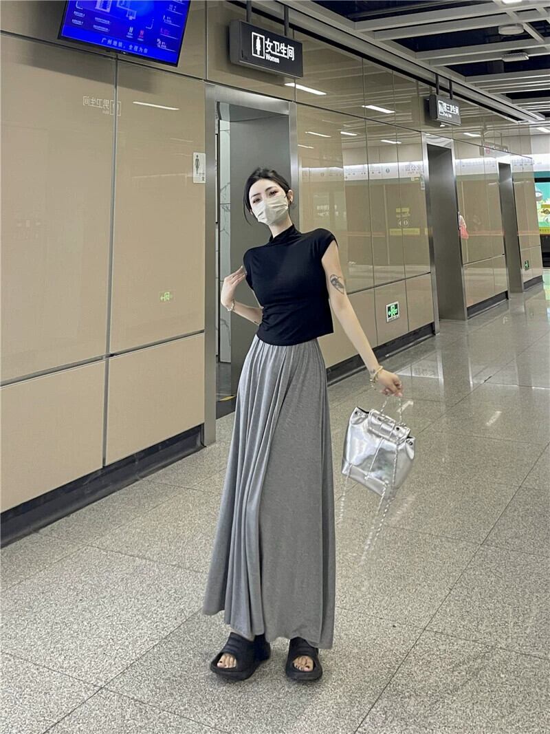 グレーカジュアルスカート女性のハイウエストドレープ A ラインスカート夏 2023 新しい梨型の図薄いロングスカート ハイウェスト サマー 夏物 Aライン 857163883532142