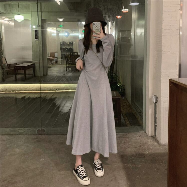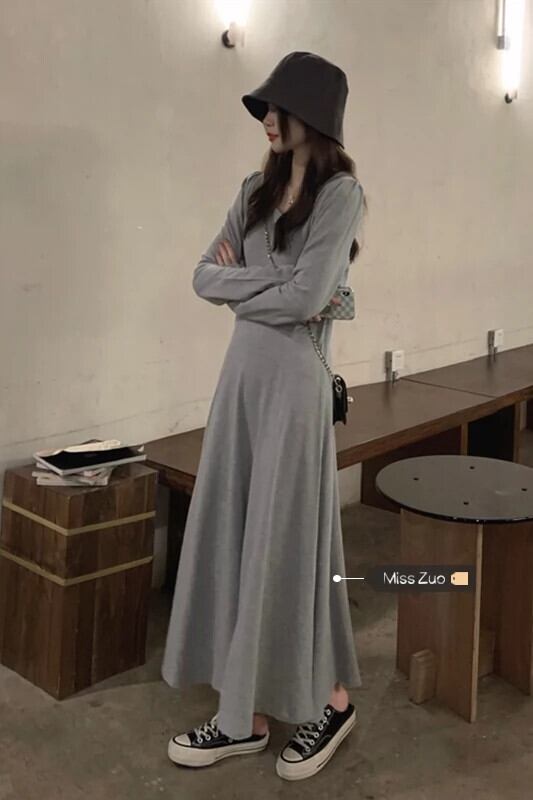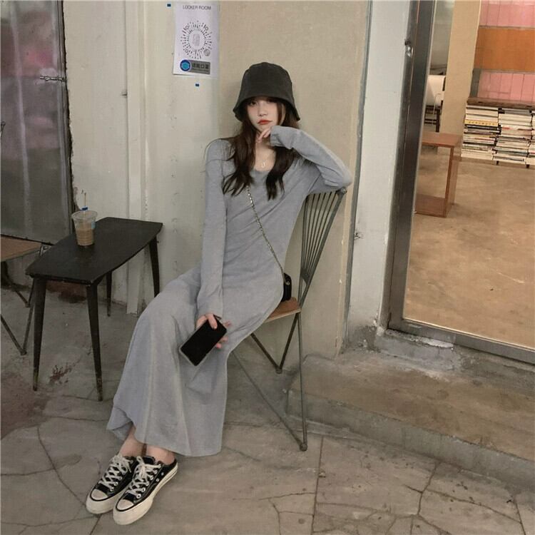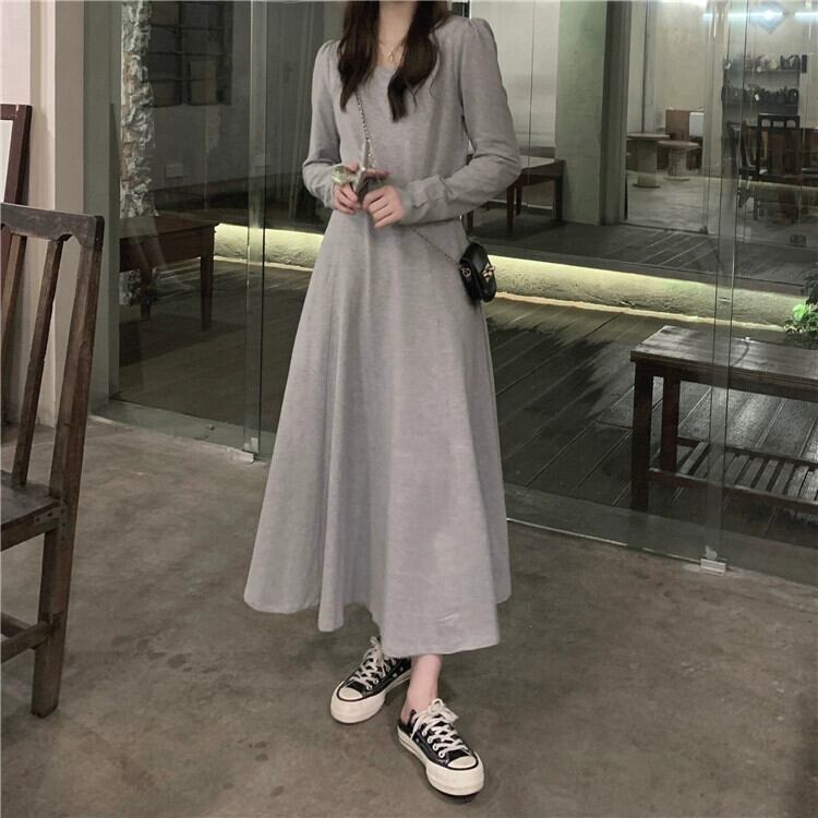 グレースクエアネックドレス婦人服春 2023 香港スタイルレトロウエスト痩身ロングスカートボトム スプリング 春物 スクウェア 8571665319194926