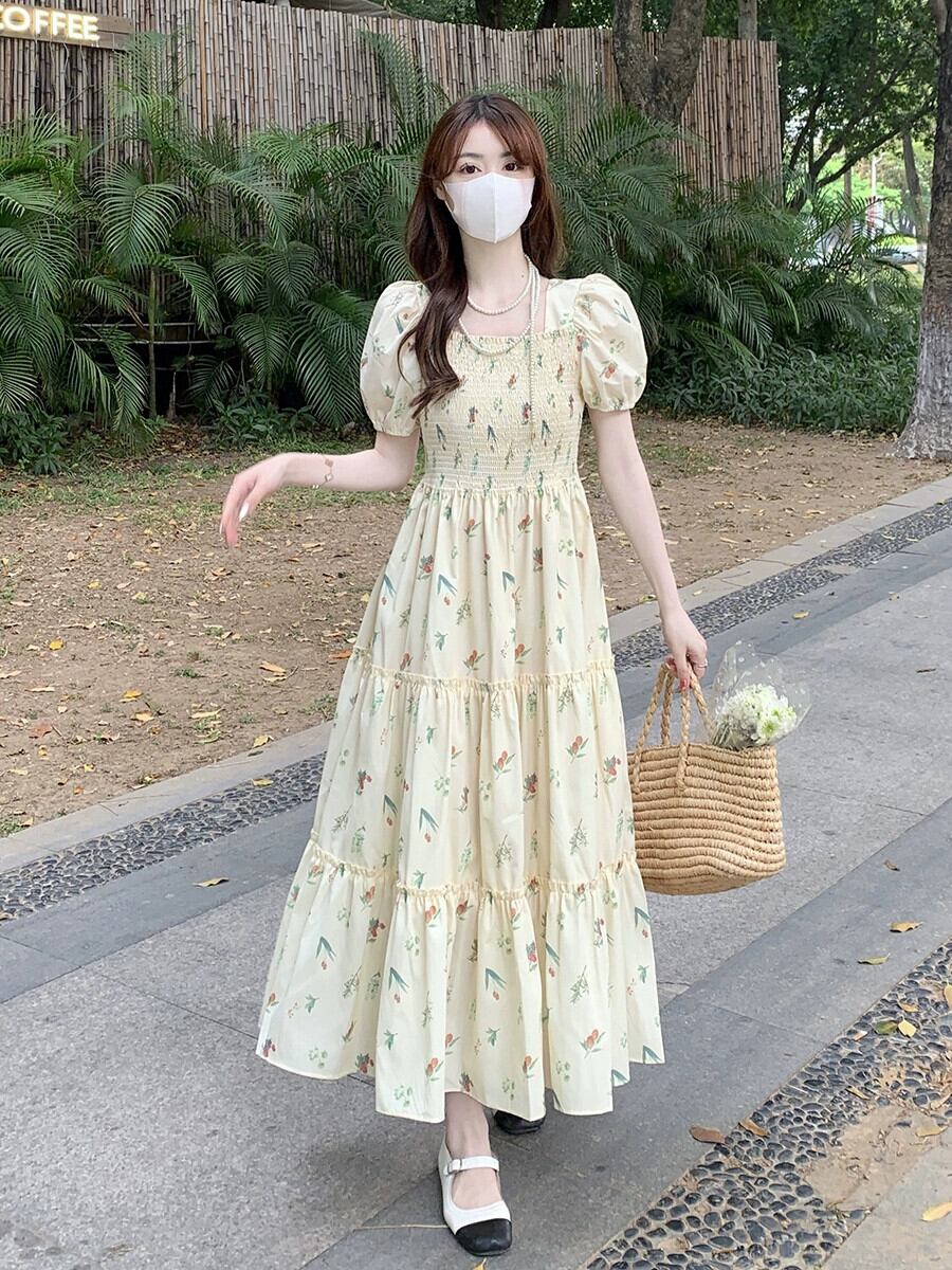 パフスリーブ花柄ドレスレディース2023夏新作フレンチスタイルニッチ優しいスタイルスクエアカラーロングスカート サマー 夏物 スクウェア 8571691757818697