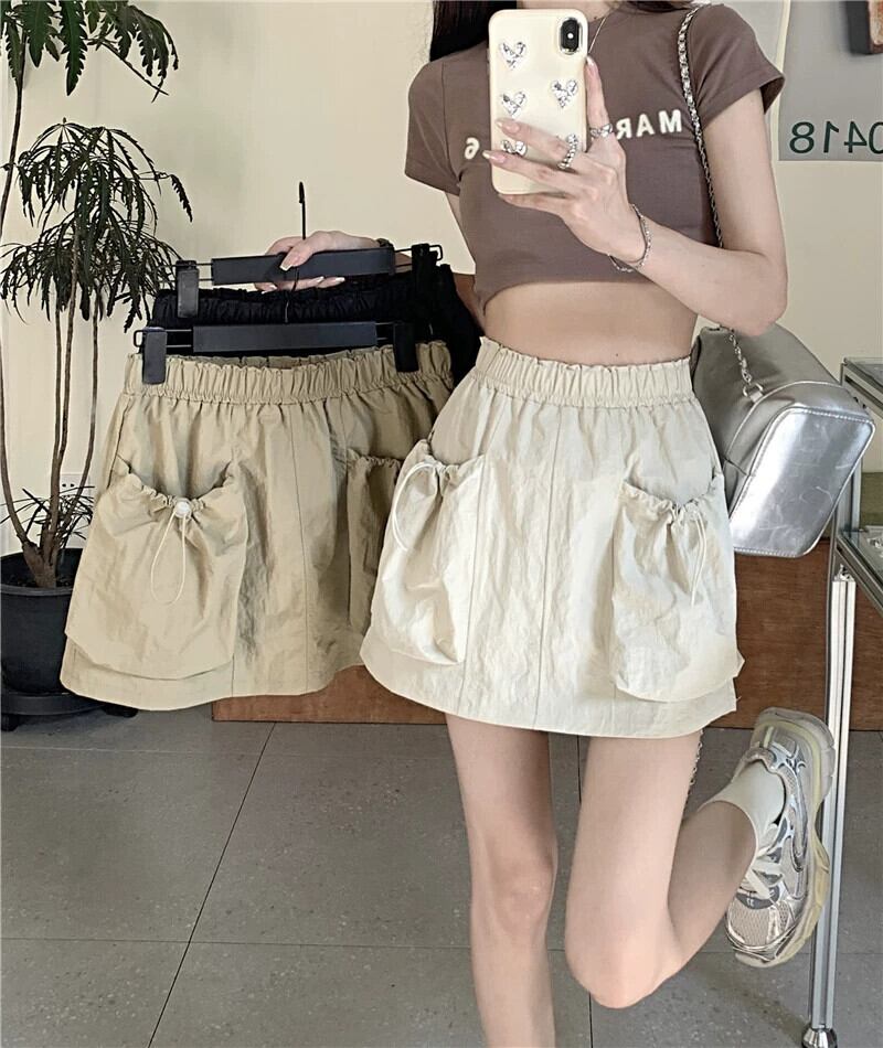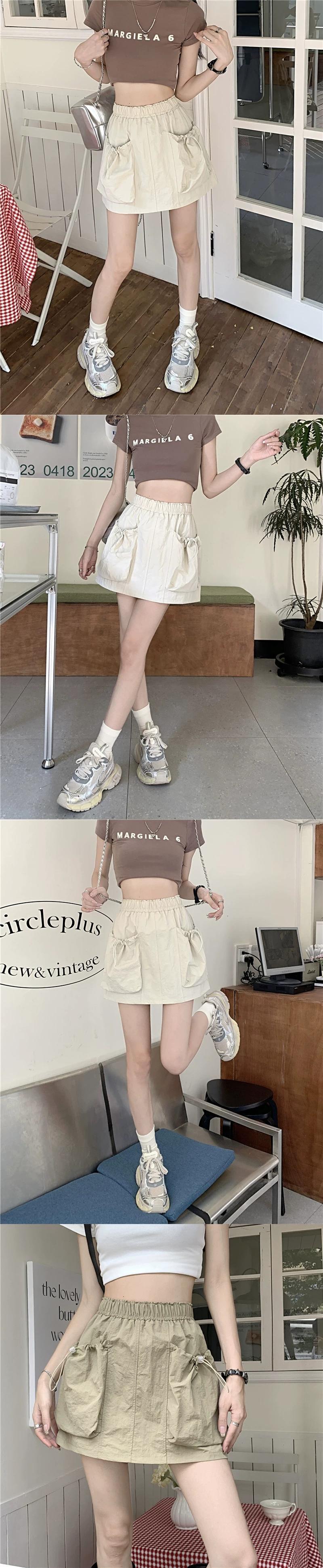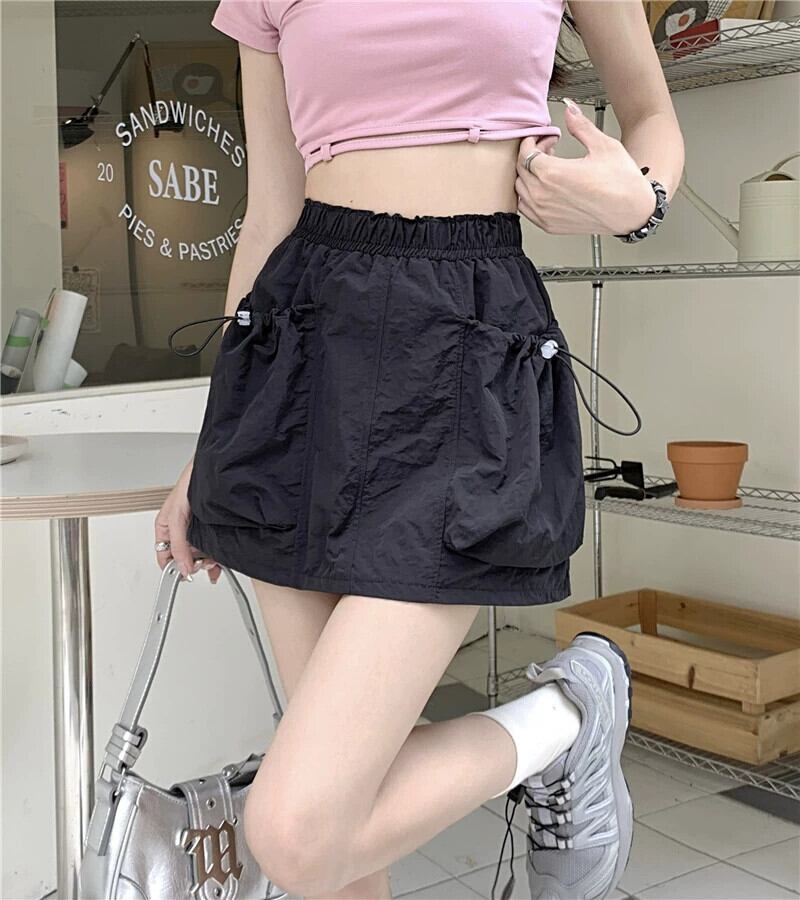 弾性ウエストツーリングスカート女性のハイウエスト A ラインスカート夏 2023 新しいビッグポケットレトロバッグヒップショートスカート ハイウェスト エラスティック 伸縮 サマー 夏物 Aライン 8571698467314517