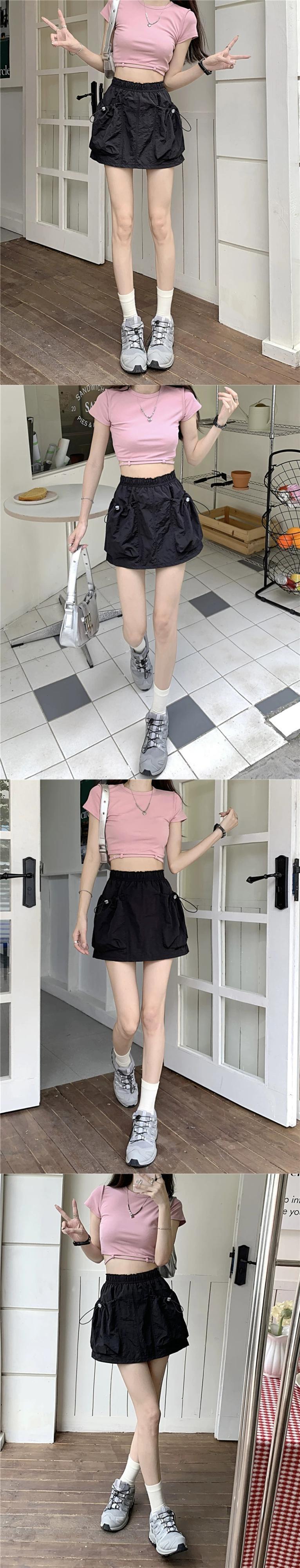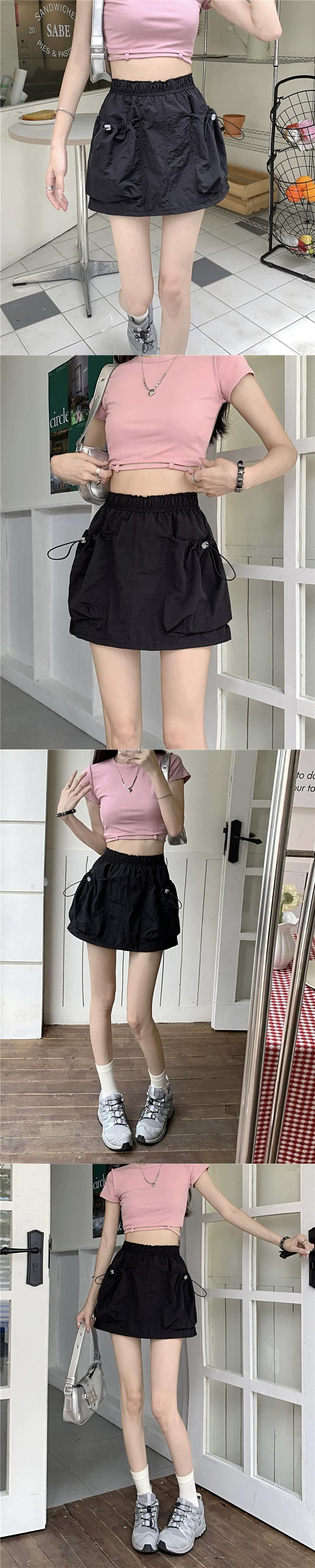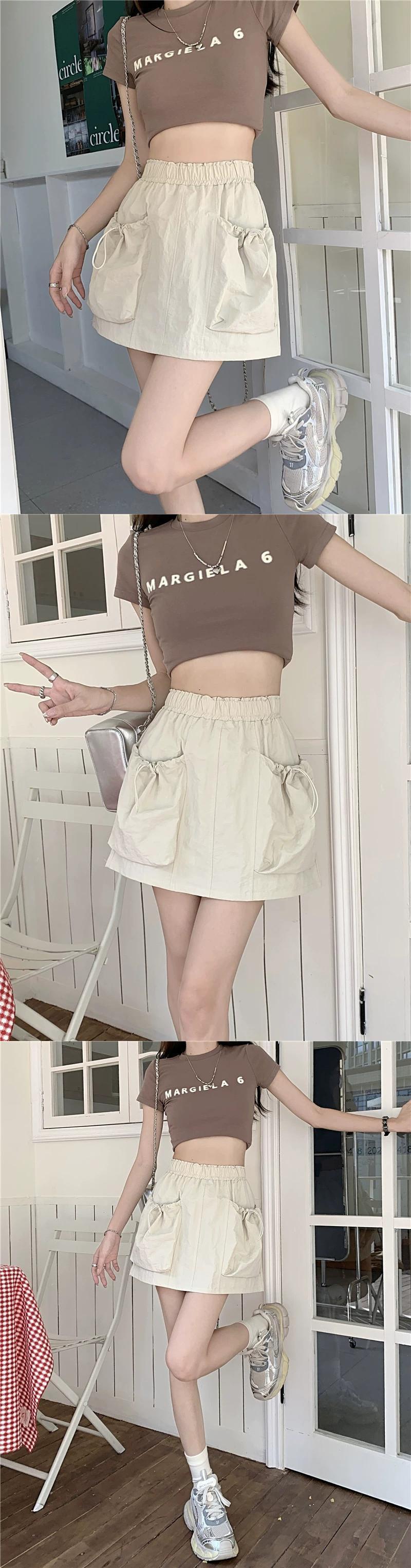 弾性ウエストツーリングスカート女性のハイウエスト A ラインスカート夏 2023 新しいビッグポケットレトロバッグヒップショートスカート ハイウェスト エラスティック 伸縮 サマー 夏物 Aライン 8571698467314517