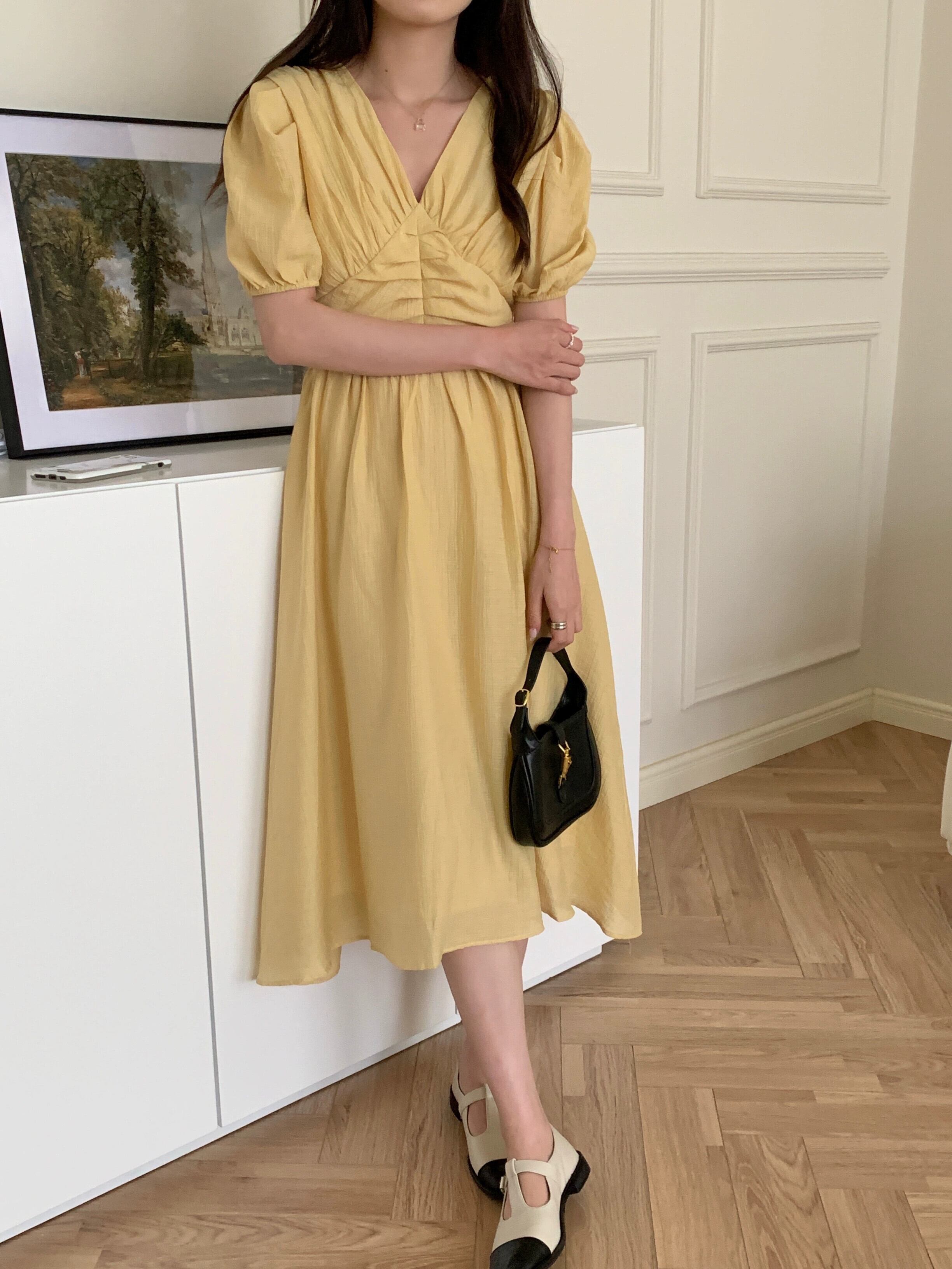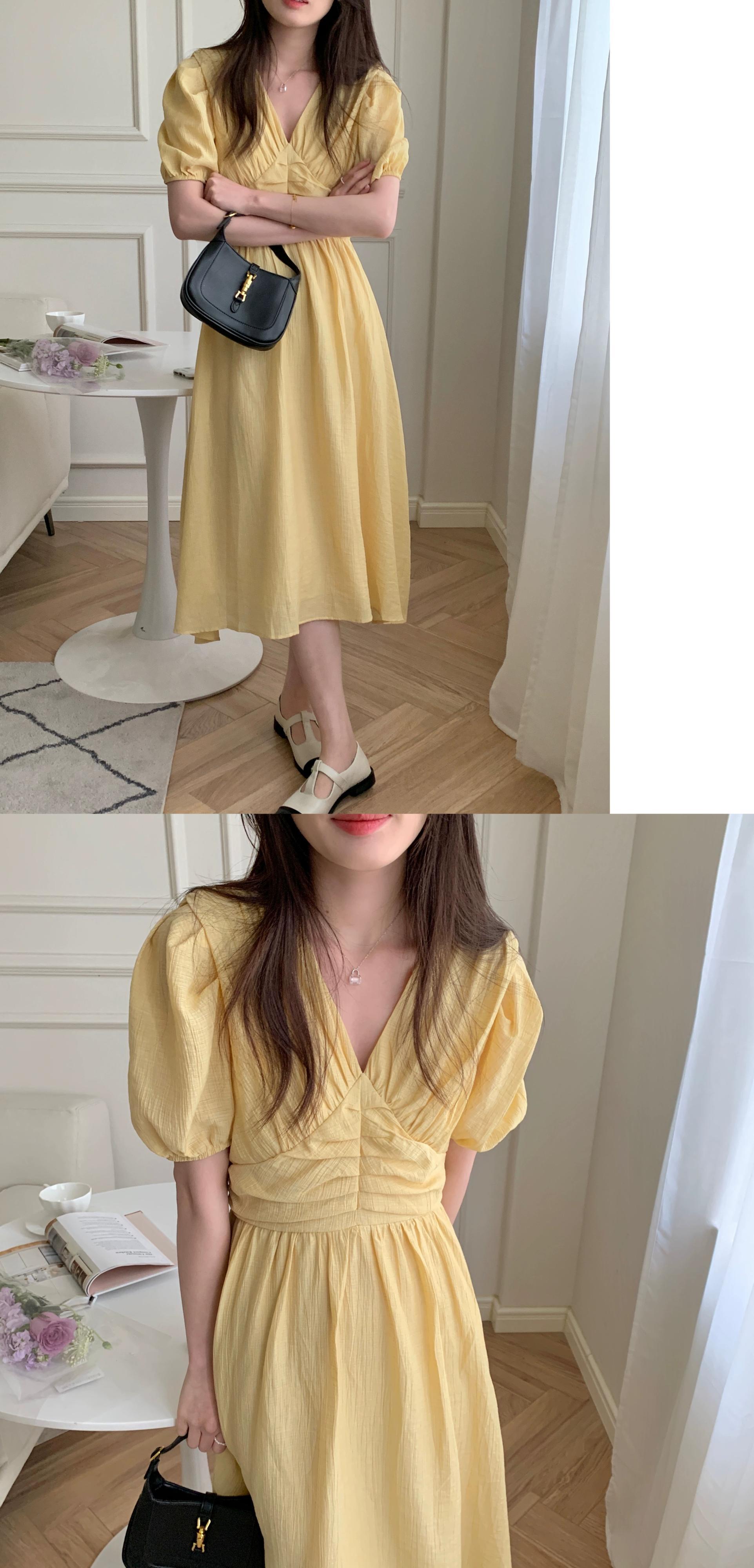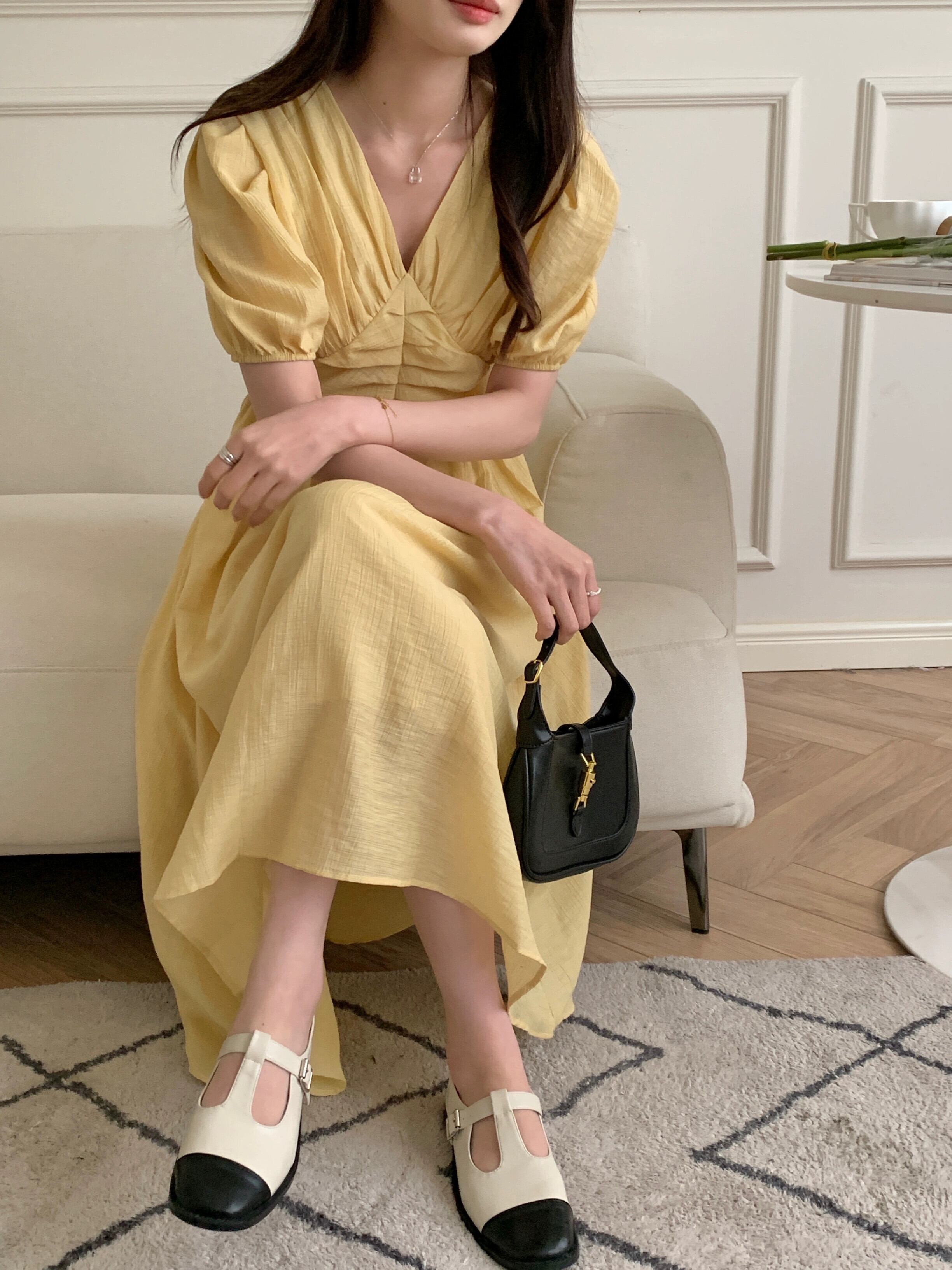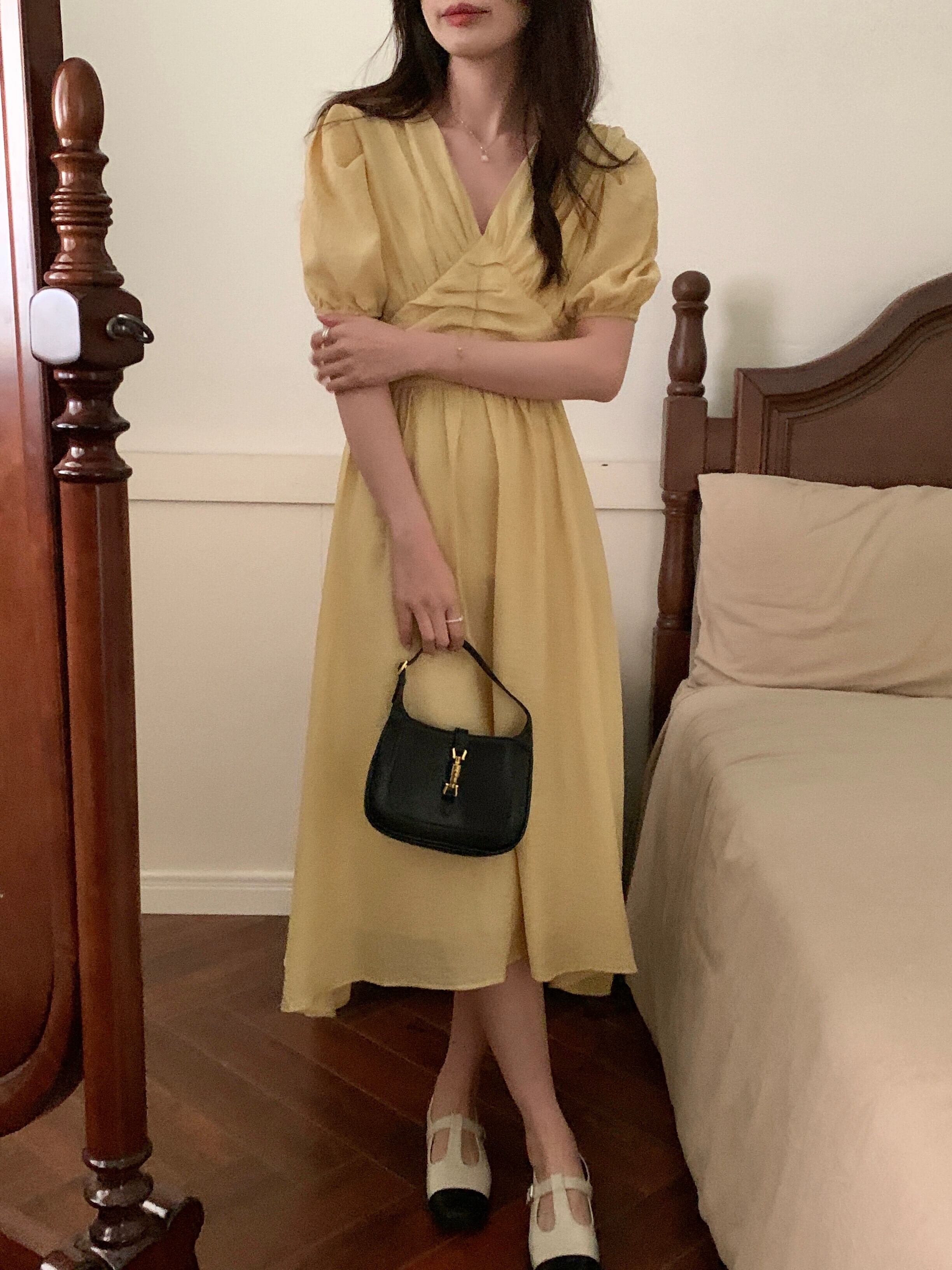 黄色のパフスリーブドレスの女性の夏の 2023 新しいフランスの初恋優しいスタイルの気質 V ネックロングスカート サマー 夏物 Vネック 8571695872223096