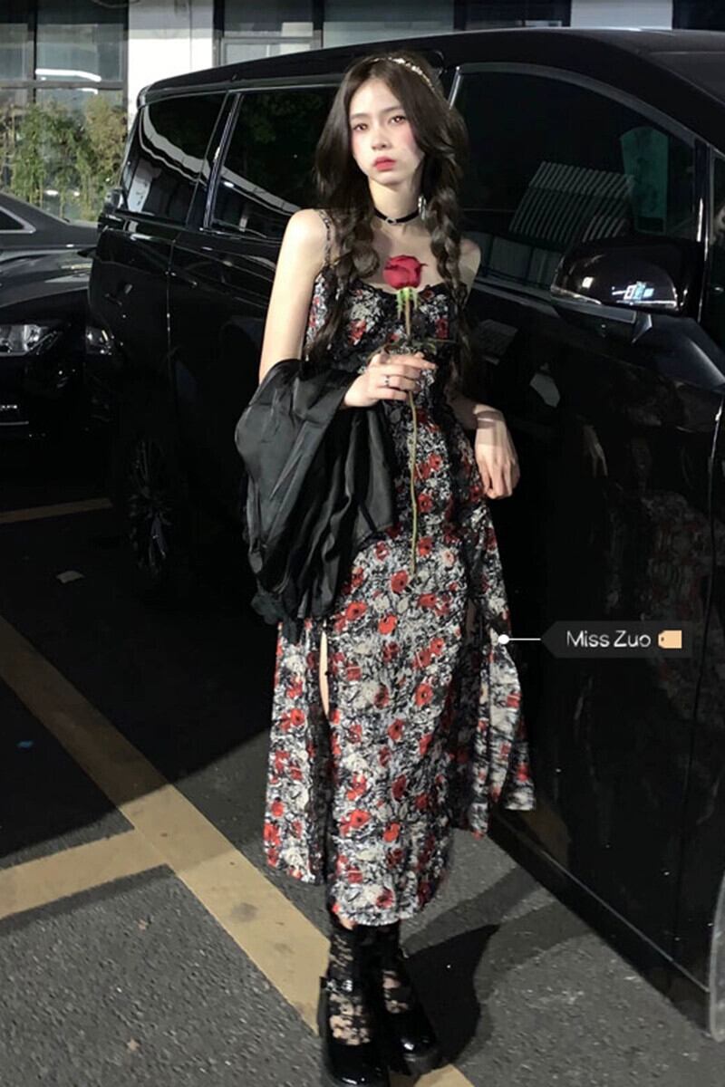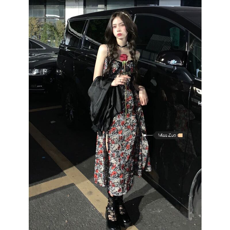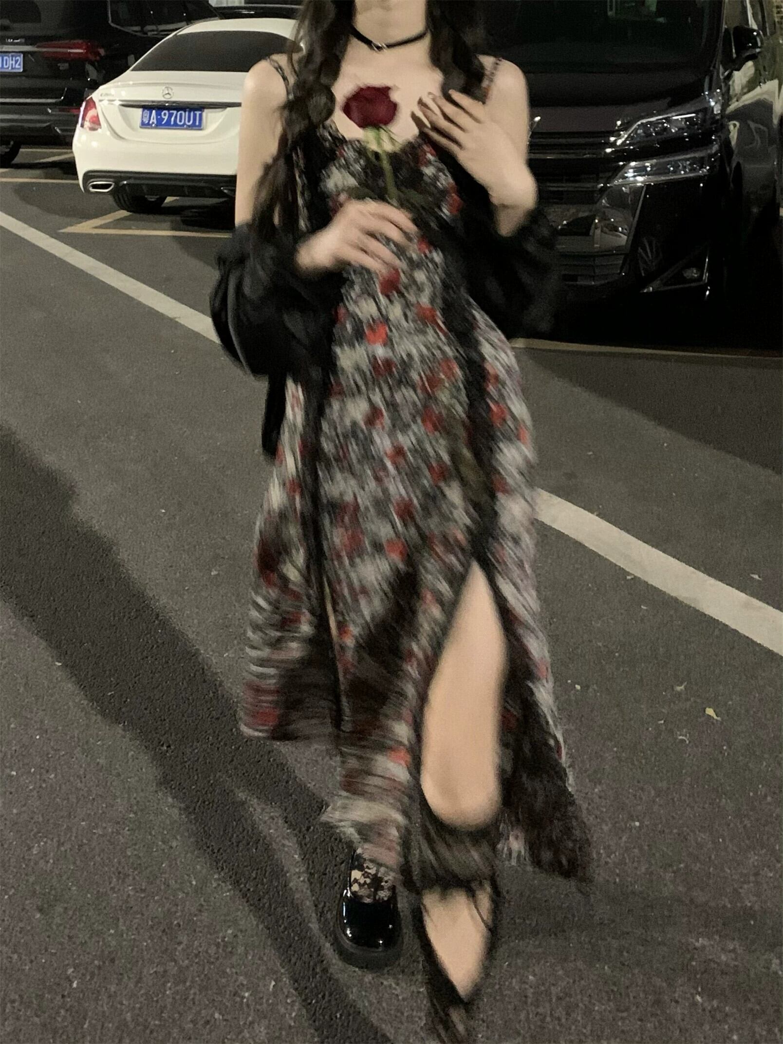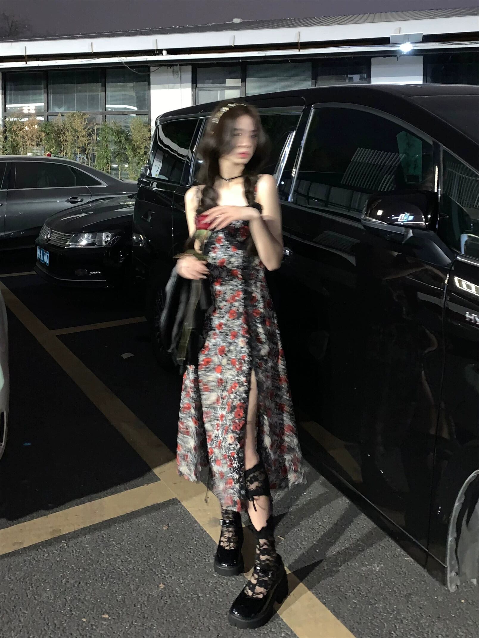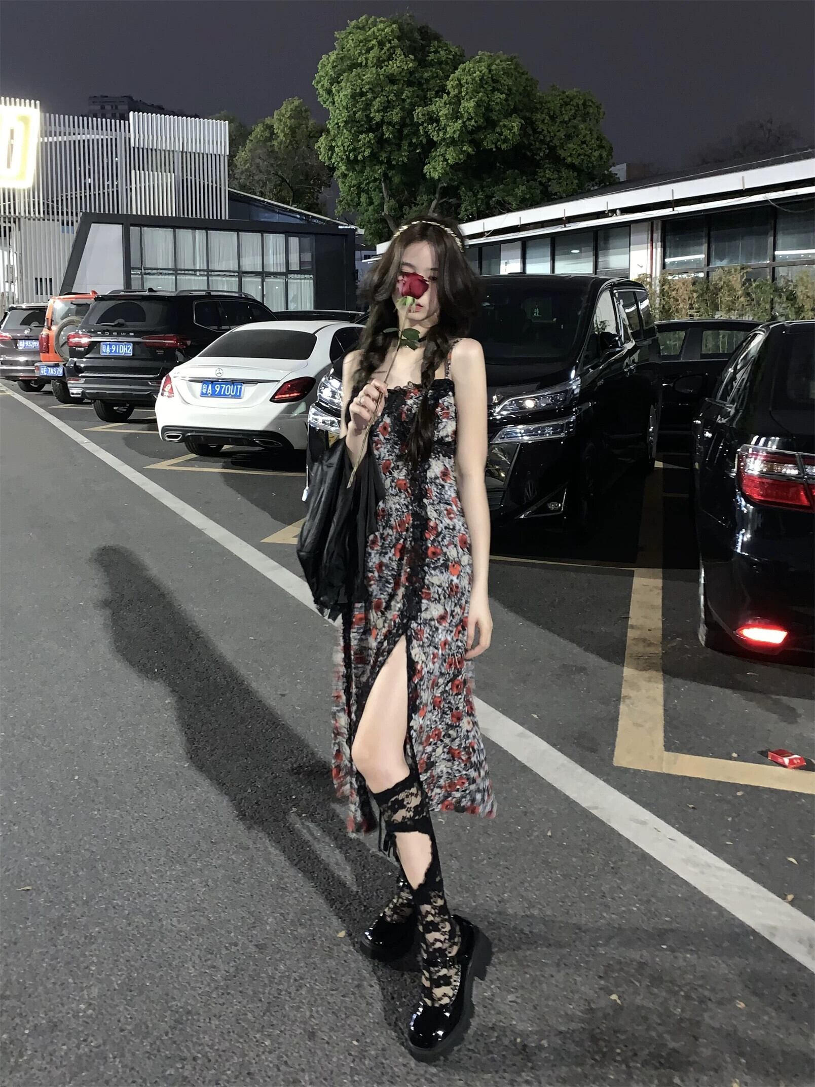 花柄スリングドレス女性の夏 2023 新しいレトロ純粋な欲望デザインセンスニッチスリットロングスカート サマー 夏物 ピュア 8571668586437709