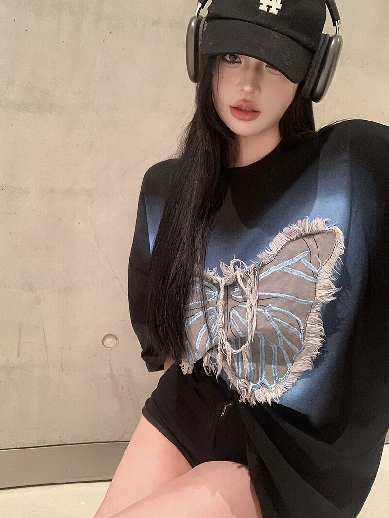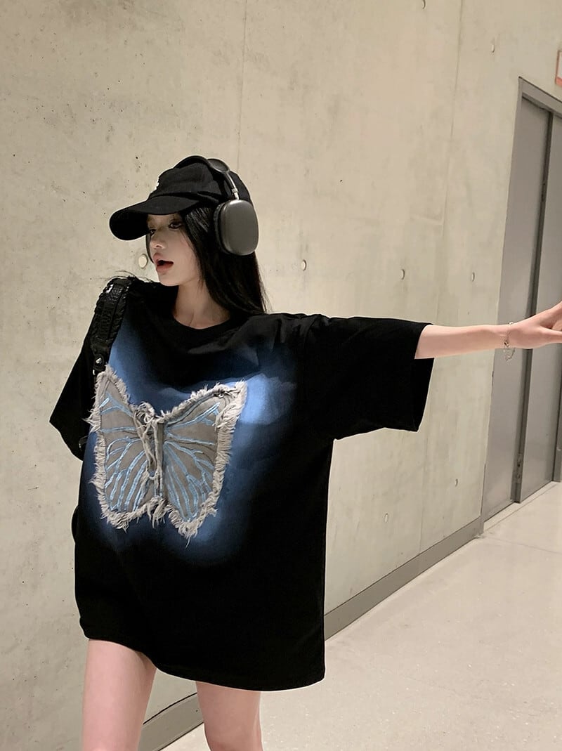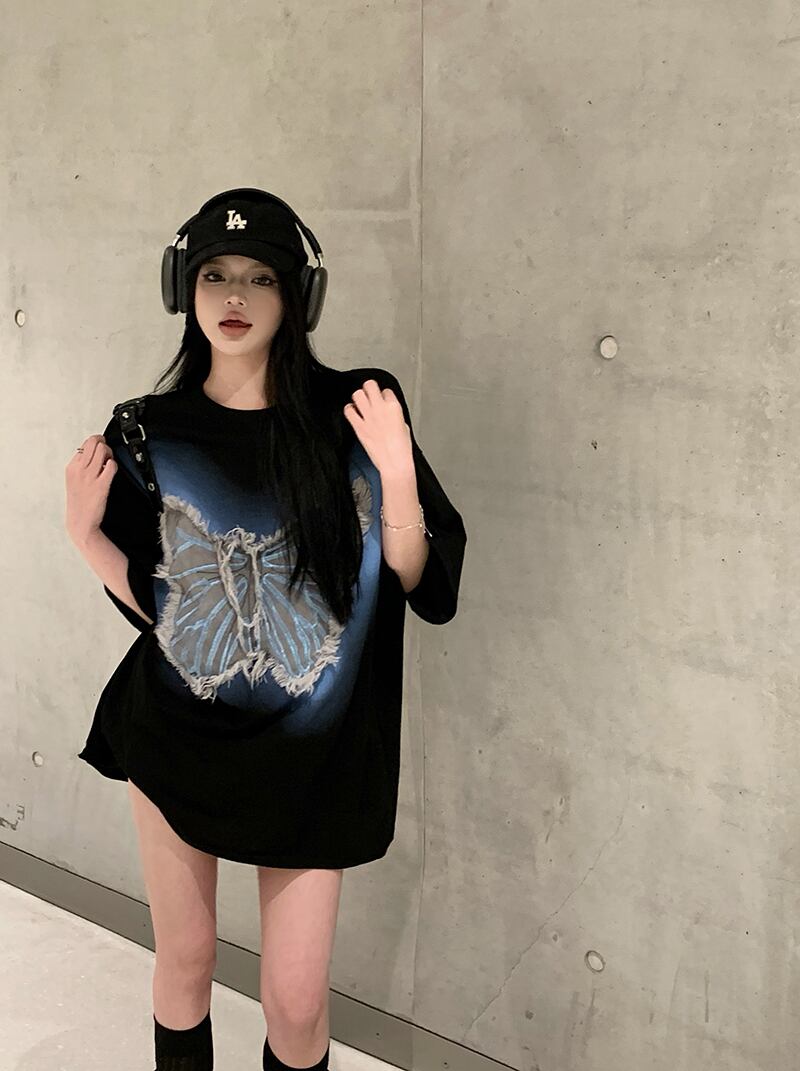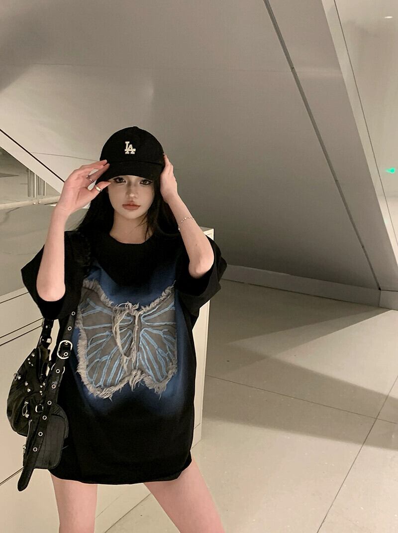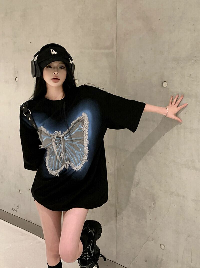 バタフライパッチ半袖Tシャツレディース2023年夏新作アメリカトレンドブランドゆったり黒肉巻きカップルトップス ブラック サマー 夏物 8571665572495187