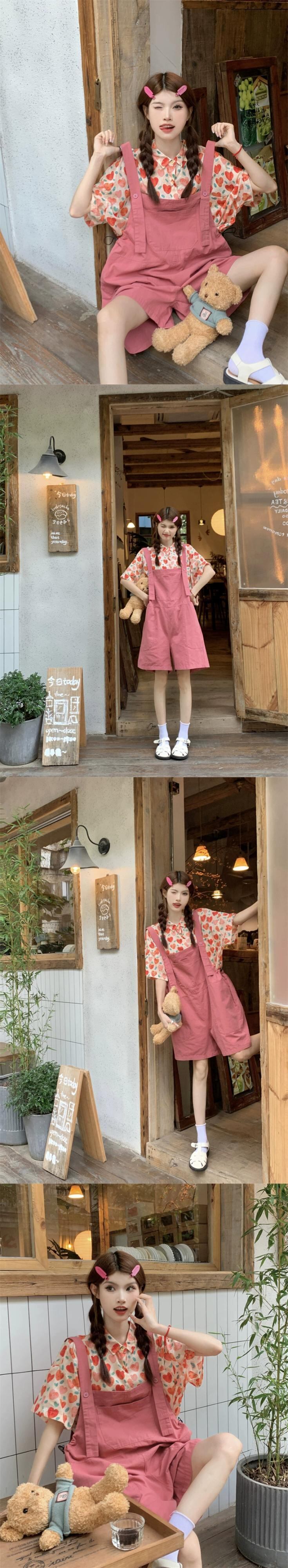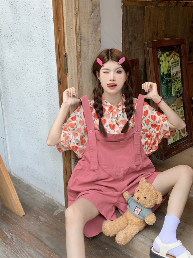 色:黄色いハートのシャツ,赤いハートのシャツ,オレンジビブパンツ,ピンクのオーバーオール