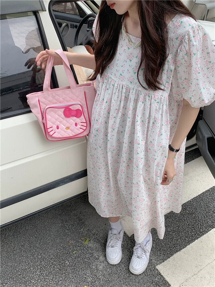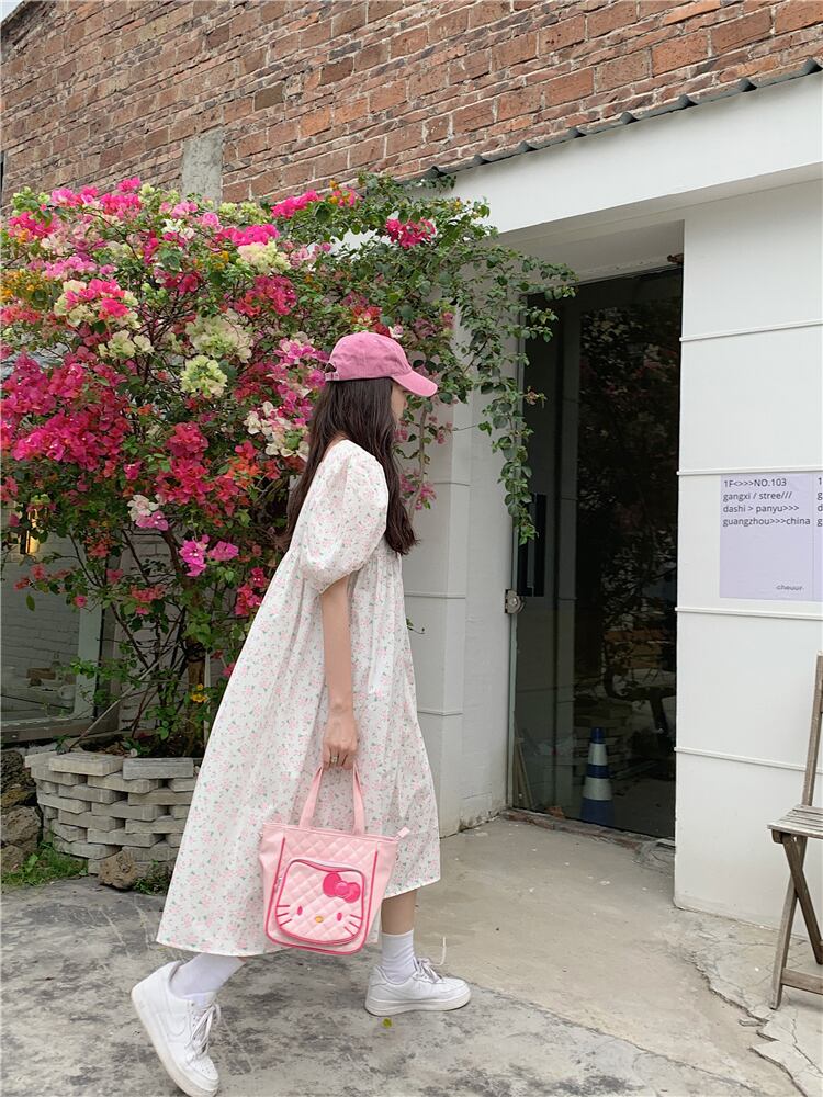 パフスリーブ花柄ドレスの女性の 2023 夏の新しい小さな新鮮で甘いスタイルの優しい風スクエアカラーロングスカート 大人ガーリー スウィート キュート カジュアル サマー 夏物 スクウェア 8571619054660522