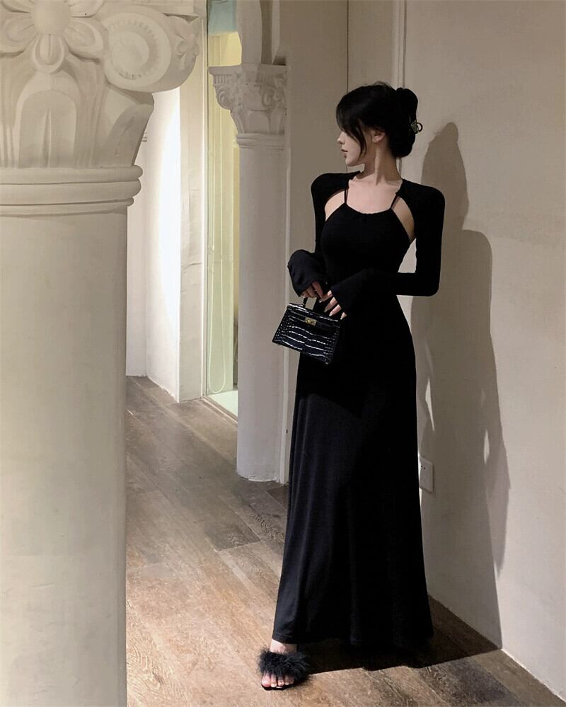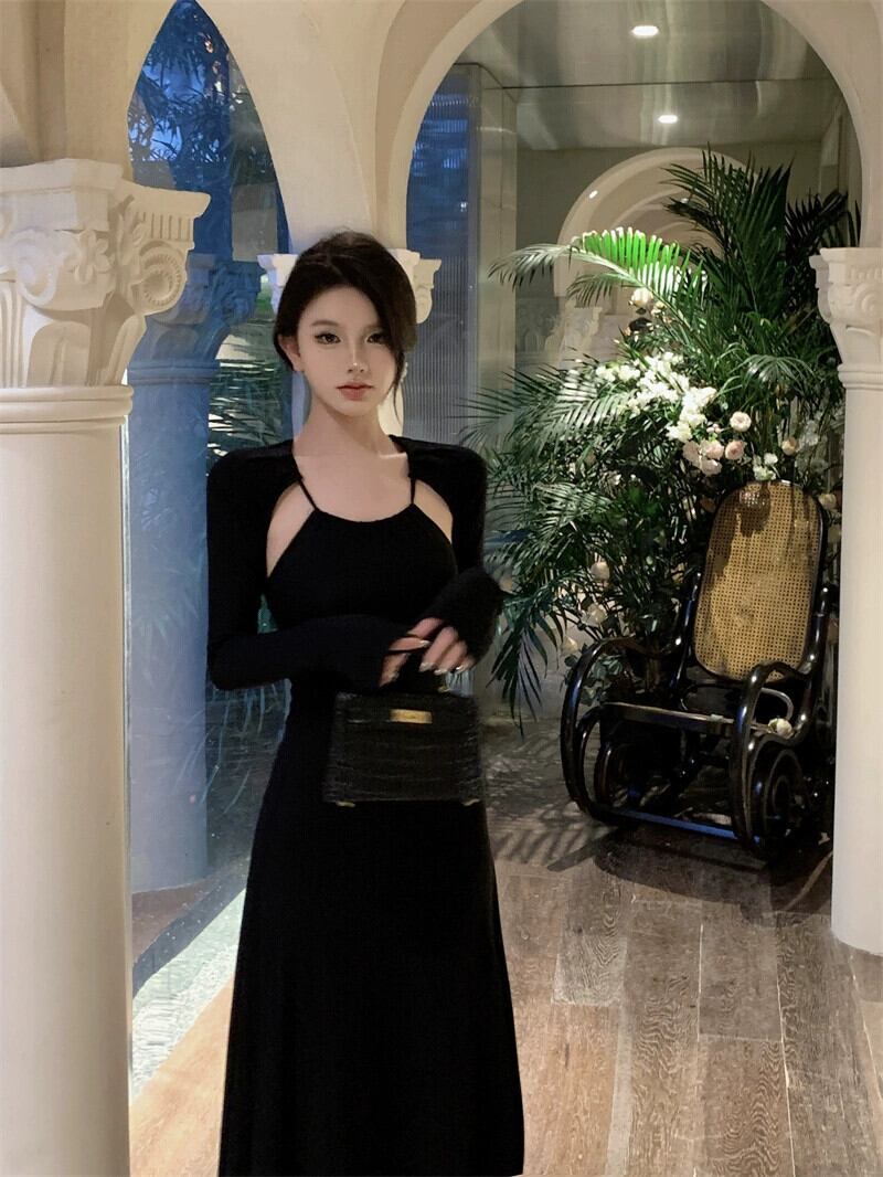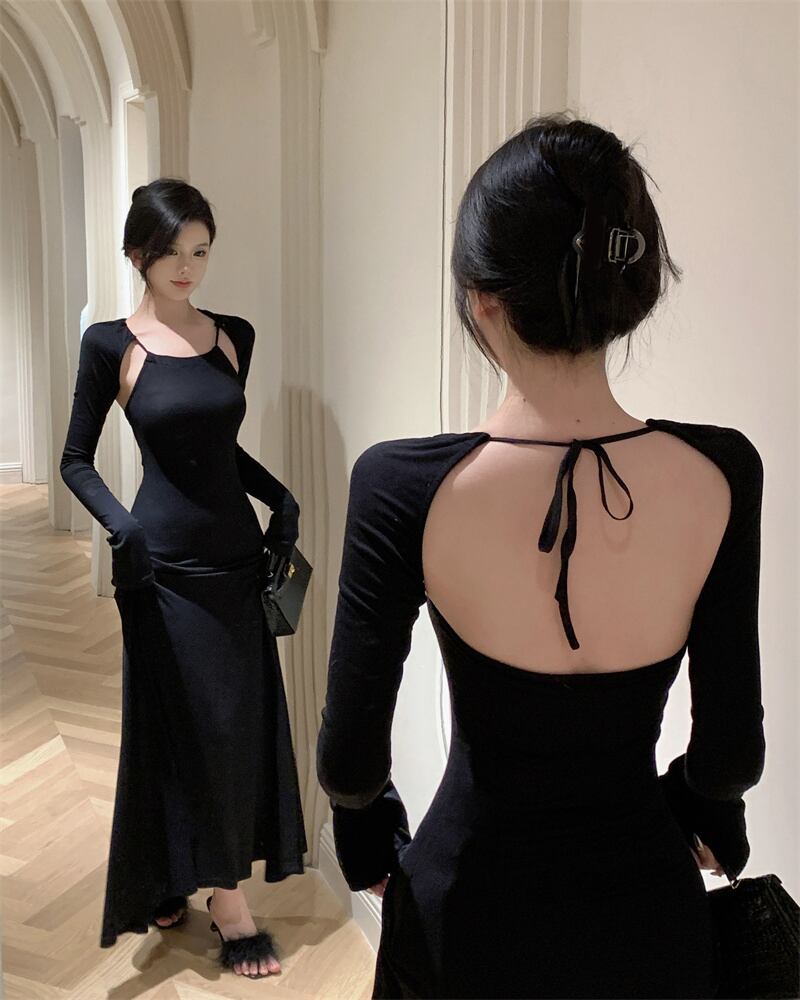 黒のバックレスドレス女性の春の摩耗ニッチデザインセクシーな純粋な欲望ユニークなユニークなロングスカート ブラック スプリング 春物 ピュア 8571614626770929