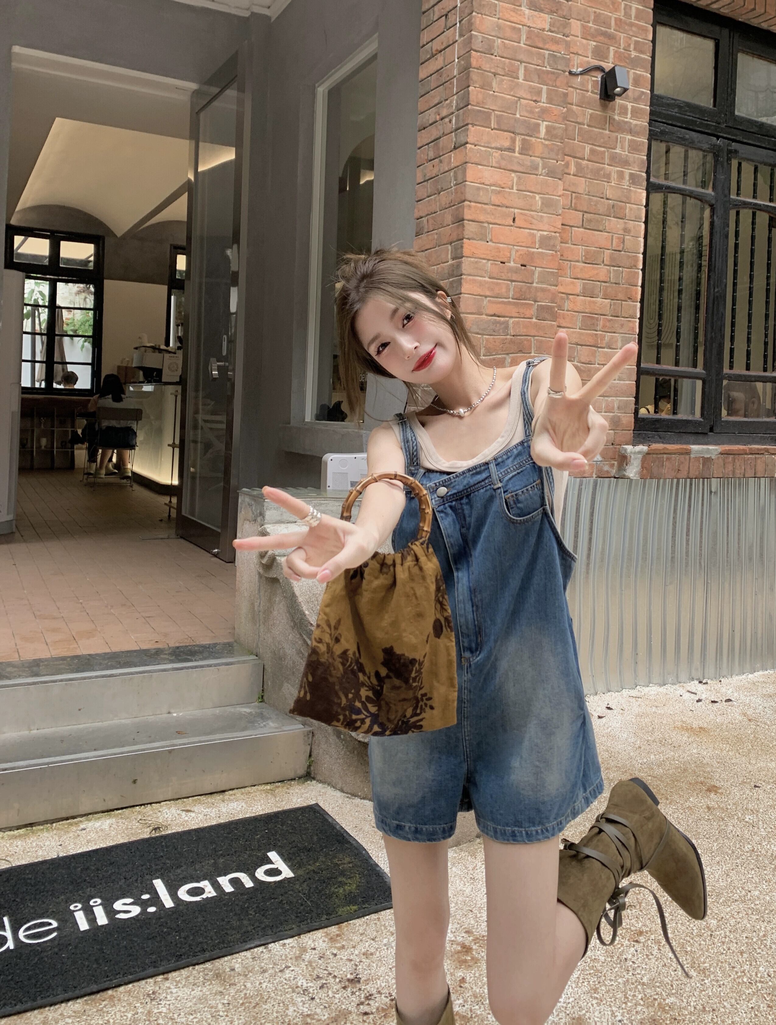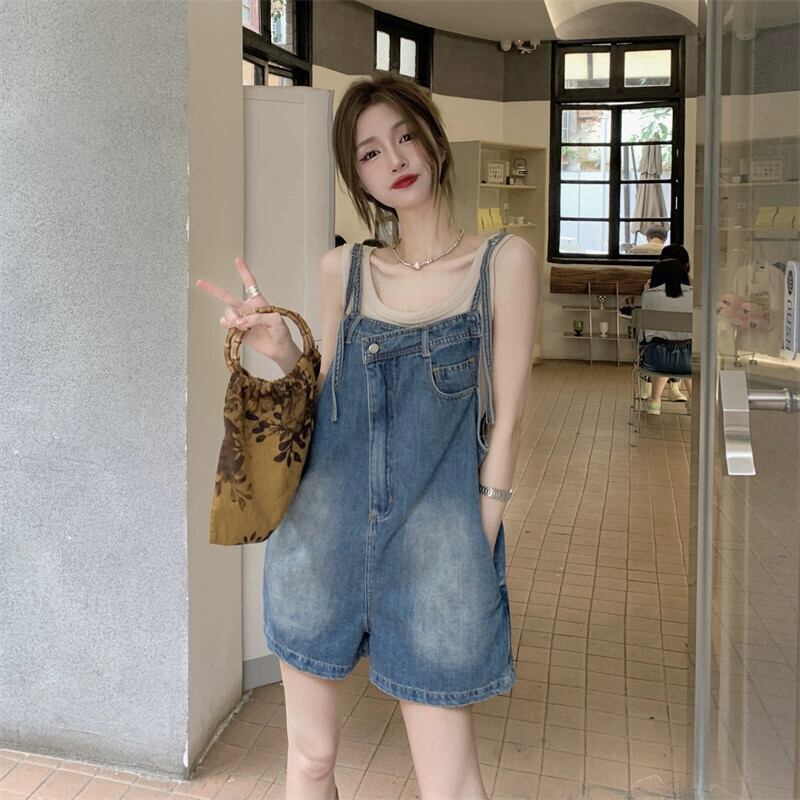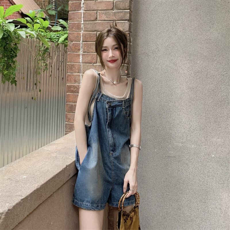 デニムオーバーオールショートレディース夏のデザインセンスニッチ2023新しい香港スタイルのレトロな小さなワイドレッグパンツ サマー 夏物 8571639595265371