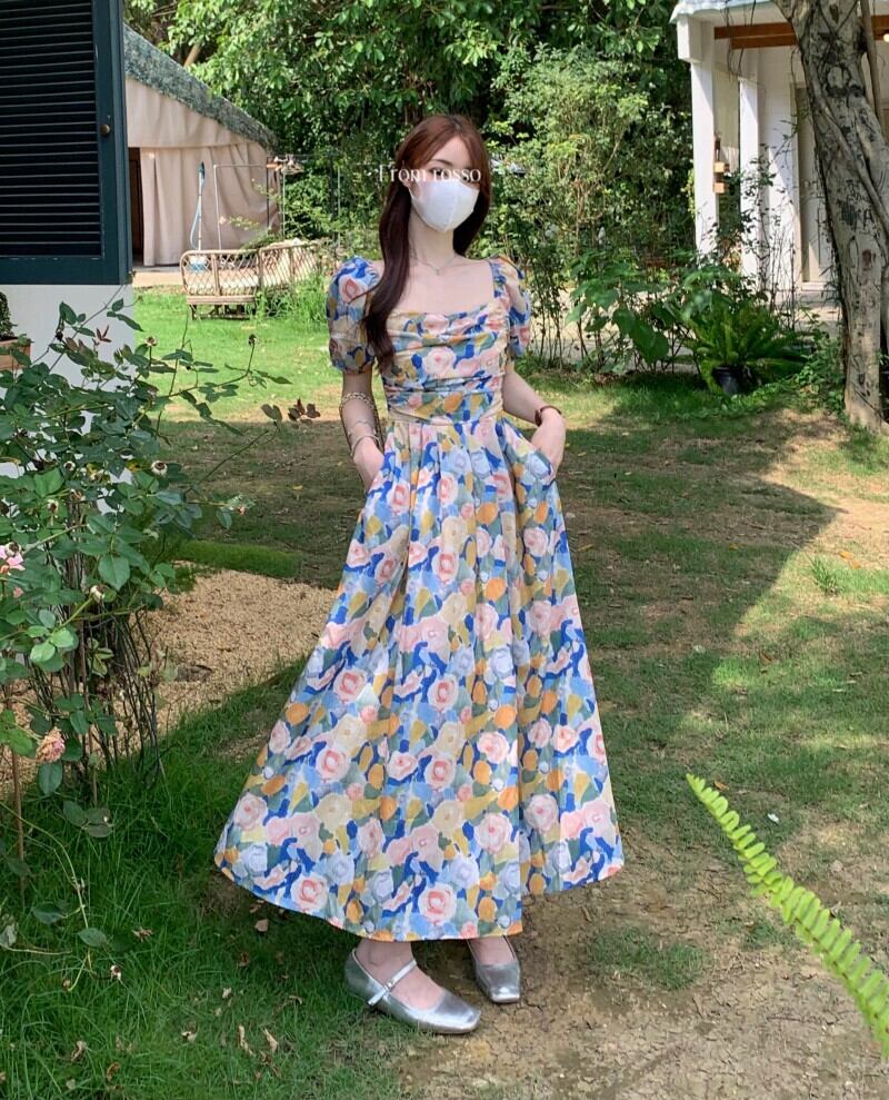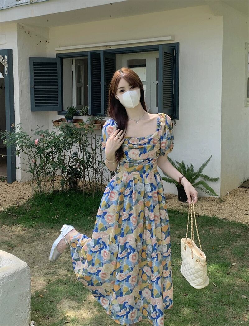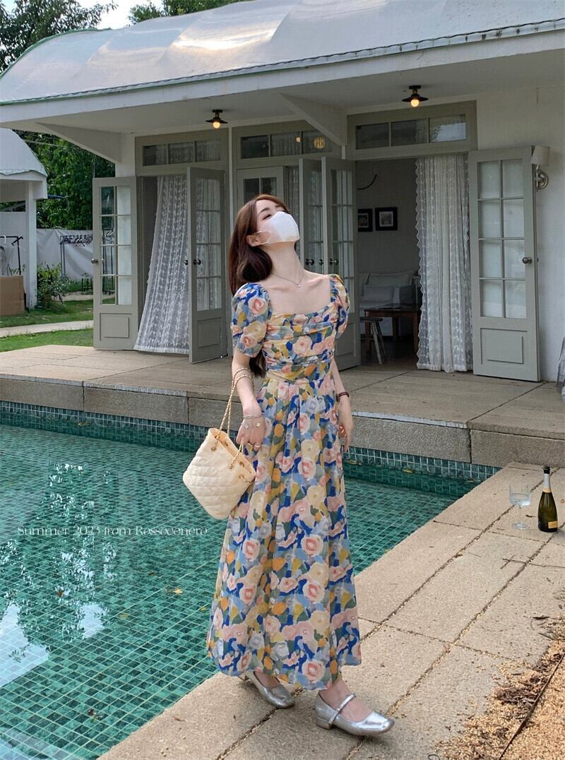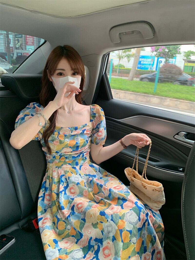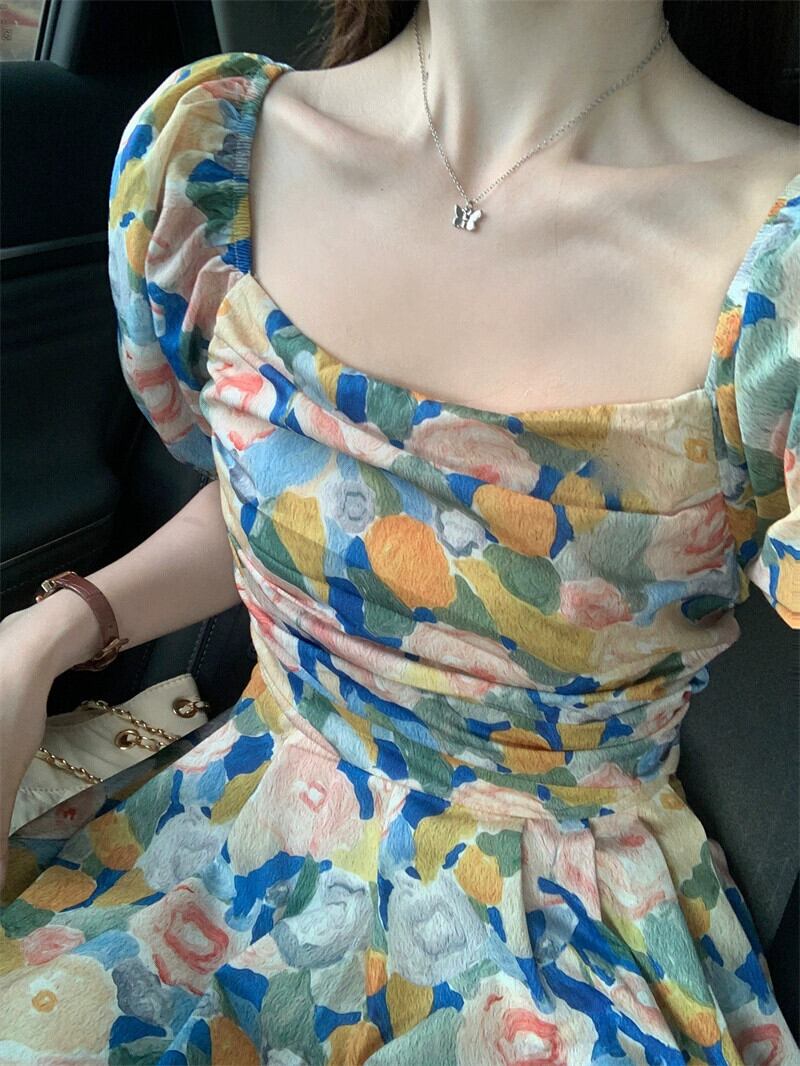 油絵花柄ドレス女性の夏 2023 新しいフレンチレトロ優しい気質スクエアカラーパフスリーブロングスカート サマー 夏物 スクウェア 8571646826355506