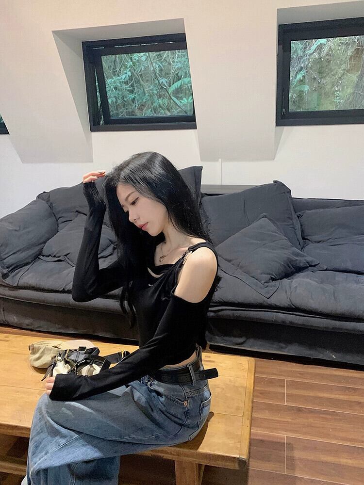 オフショルダーショートトップ女性デザインセンスニッチ2023春新作純粋な欲望シックな黒長袖Tシャツ ロング ブラック スプリング 春物 ピュア 8571637224711705