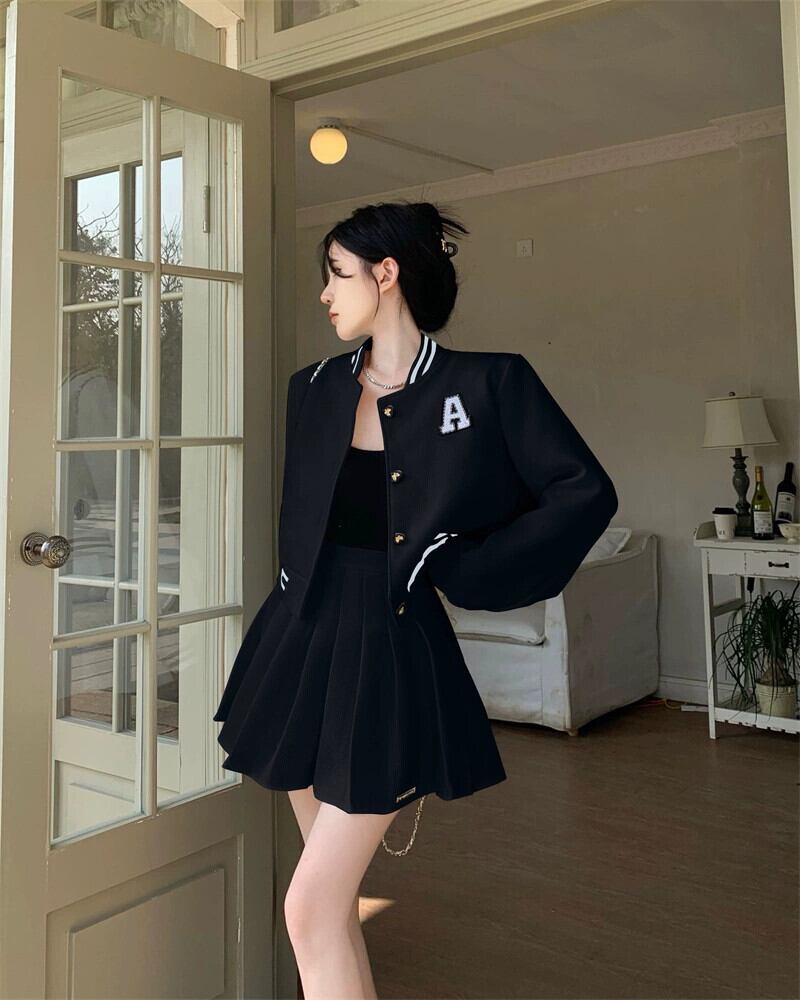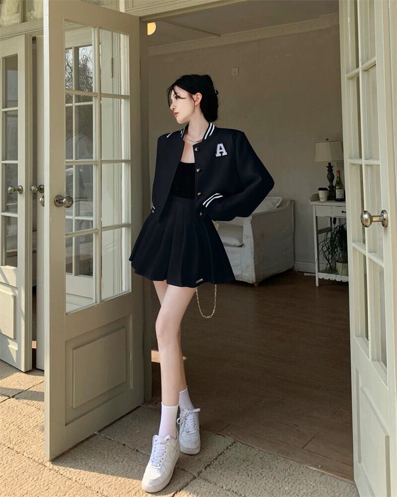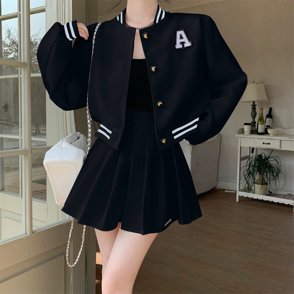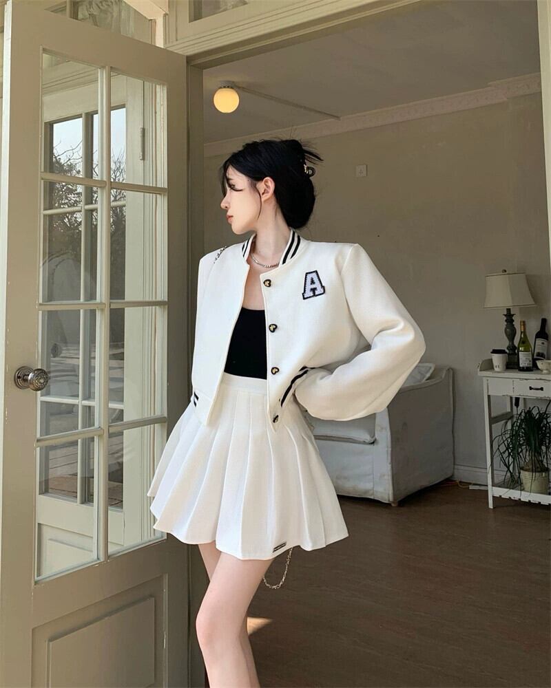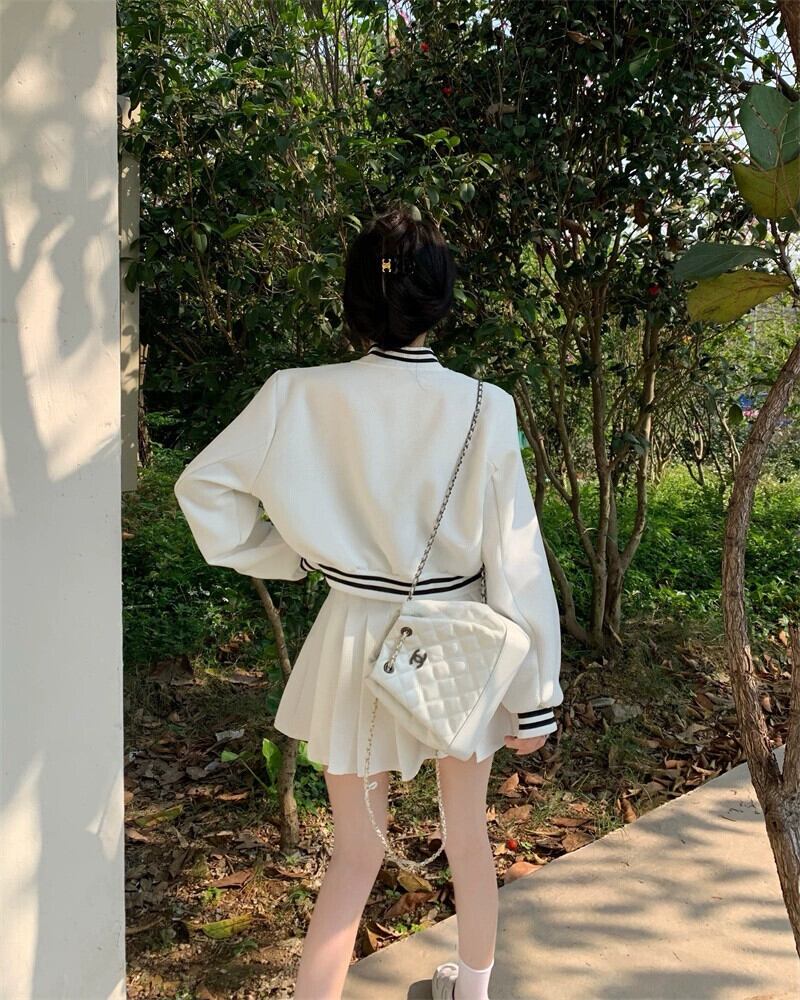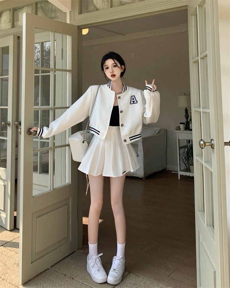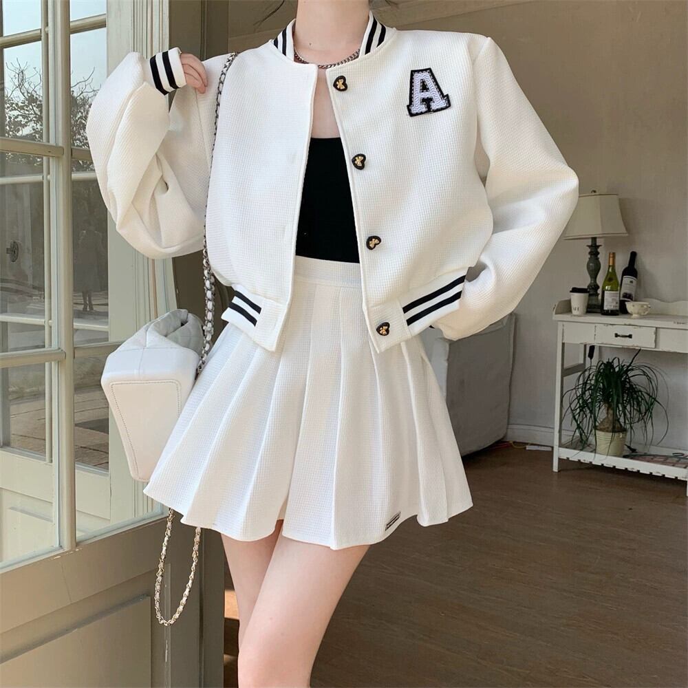 ホワイトベースボールジャケット女性 2023 春の新作アメリカンスタイルレトロハイエンドフライドストリートショートトップ 2 点セット スプリング 春物 8571658686250246