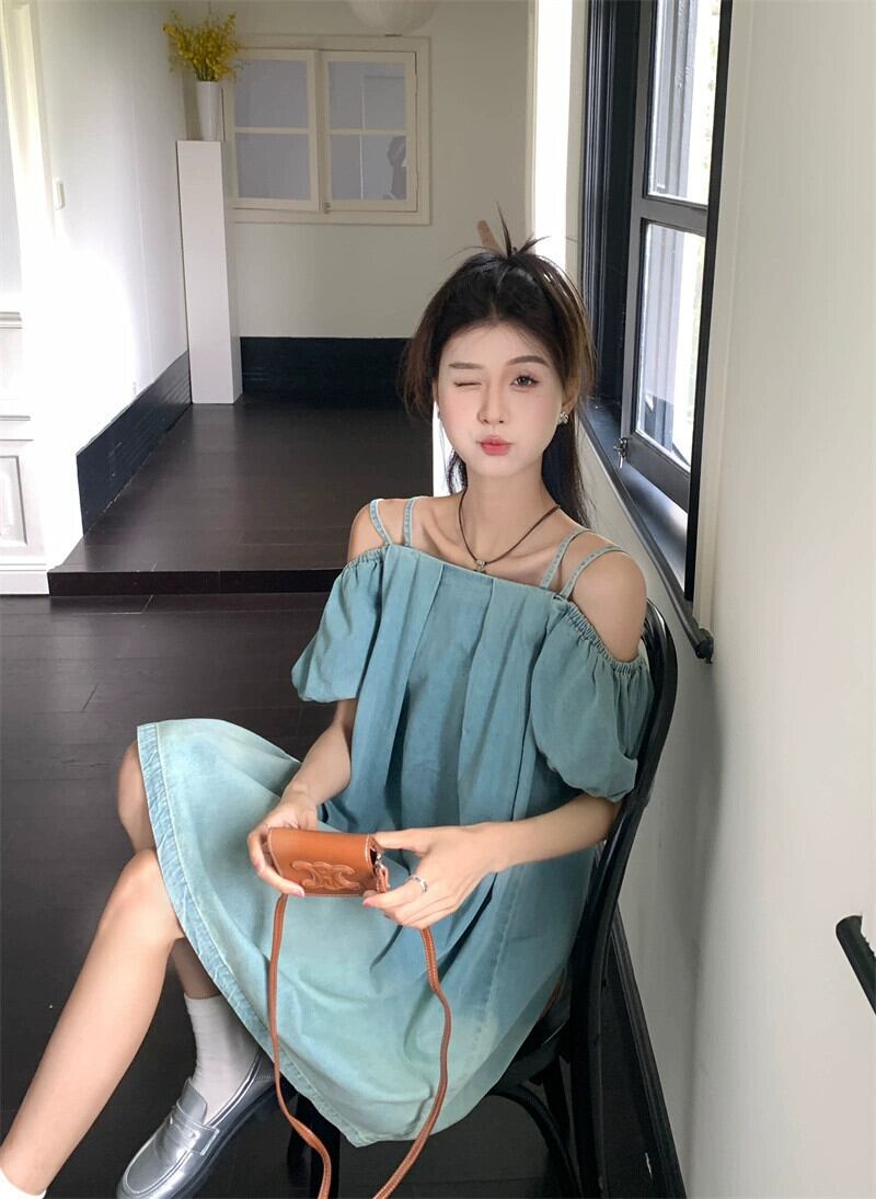 ワンショルダーデニムサスペンダードレス女性の夏の2023新しいスタイル小さな甘い腹カバーパフスリーブスカート 大人ガーリー スウィート キュート カジュアル サマー 夏物 8571617839355863