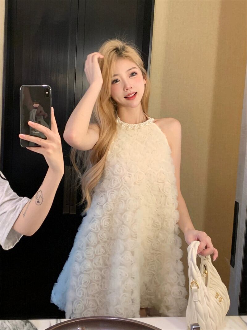 重工業立体フラワーハンギングネックドレス女性の夏のニッチデザインハイエンドフランスの気質スーパー妖精ショートスカート サマー 夏物 フラワーデザイン 8571652046361465