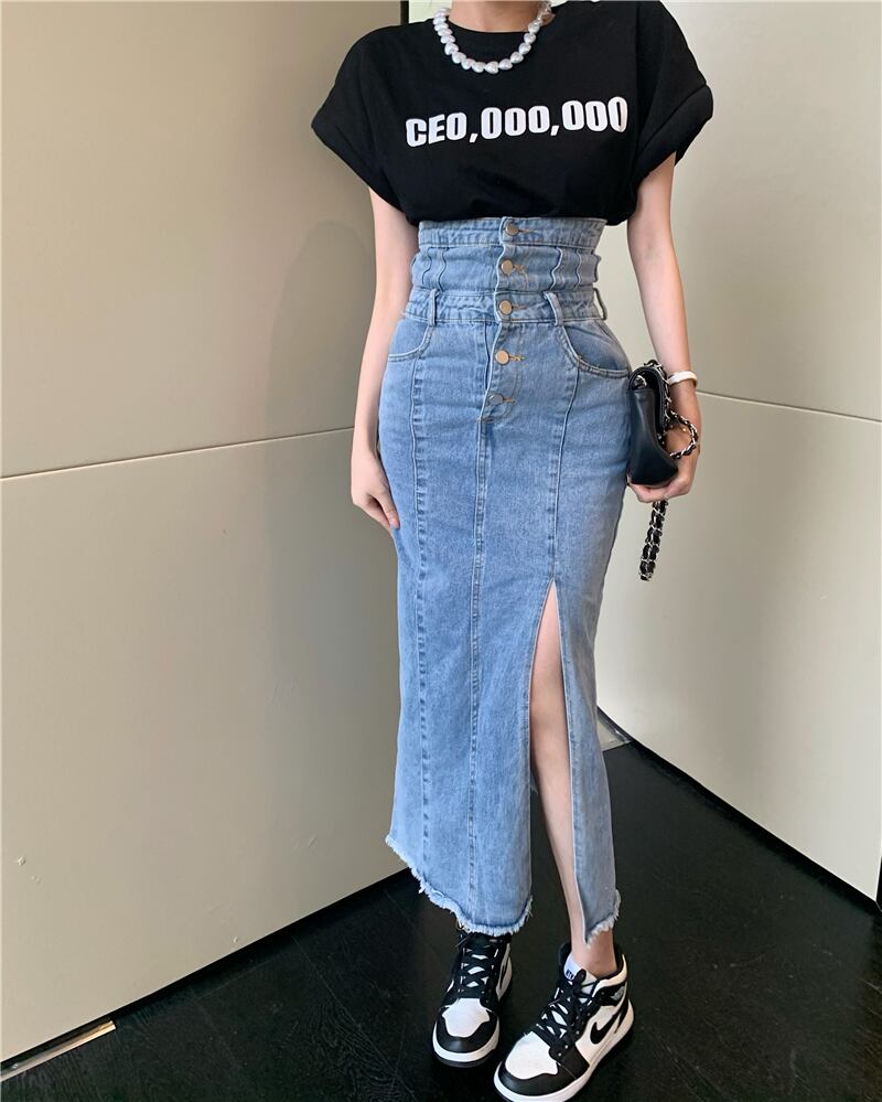 スリットデニムスカートレディース夏デザインセンスニッチ2023新作ハイウエストミドル丈バッグヒップスカート ハイウェスト サマー 夏物 8571696599167383