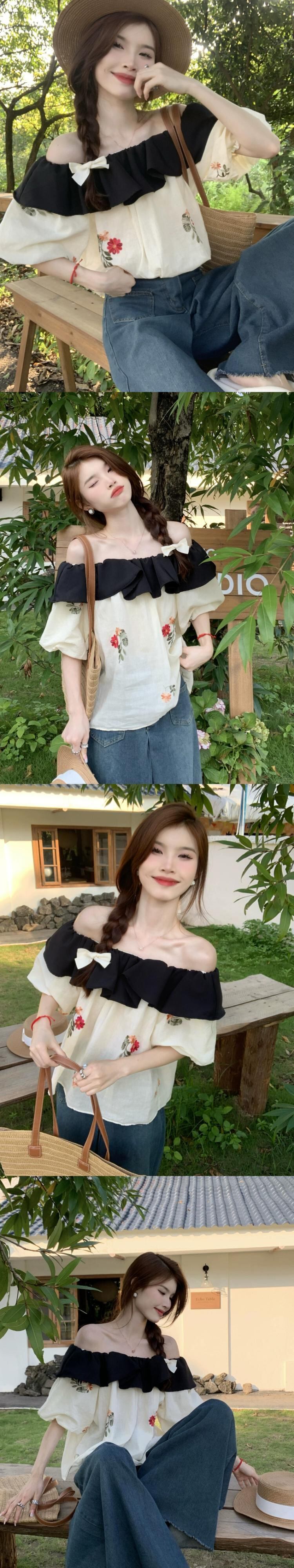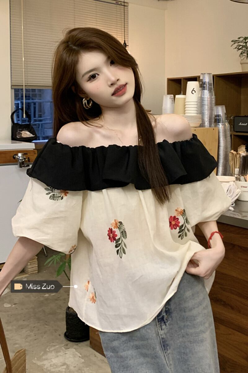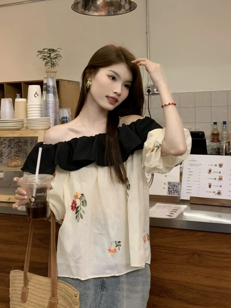 ワンショルダーフリルトップスレディース夏デザインセンスニッチフレンチ甘く優しい刺繍半袖シャツ レッド 大人ガーリー スウィート キュート カジュアル サマー 夏物 8571610771670537