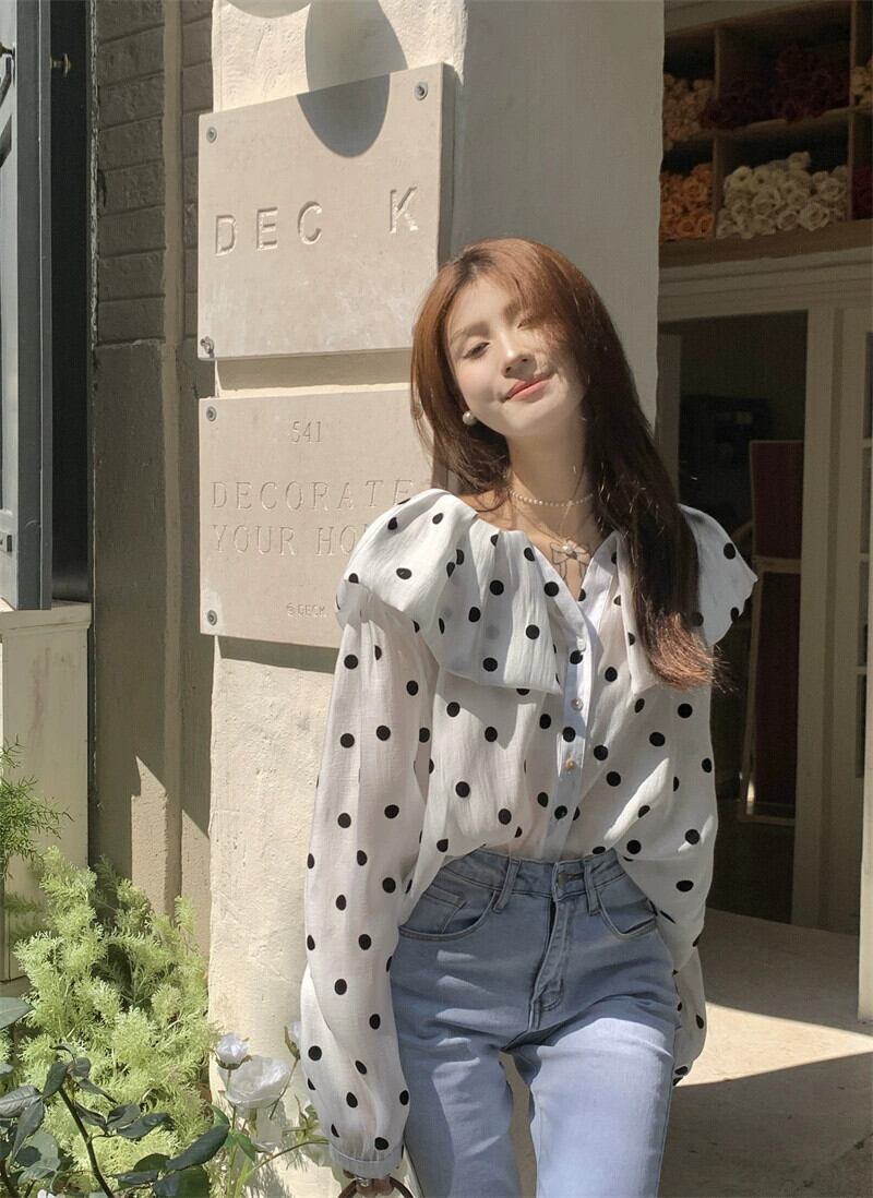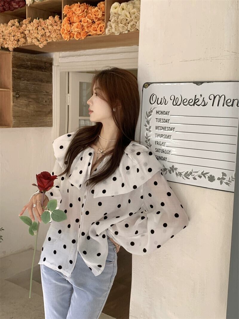 ドールカラー水玉シャツレディースデザインセンスニッチ2023春新作フレンチ甘くシックな長袖トップ ロング 大人ガーリー スウィート キュート カジュアル スプリング 春物 8571653254143047