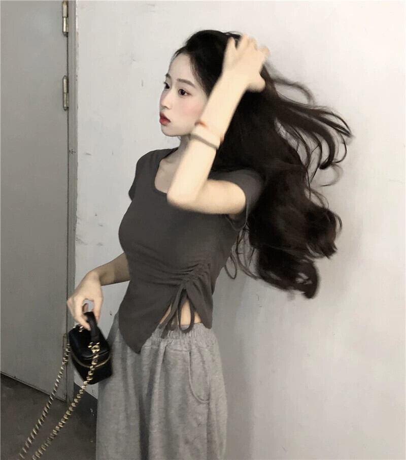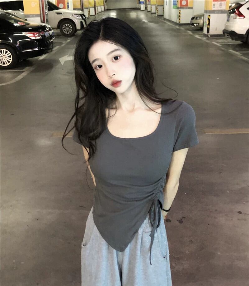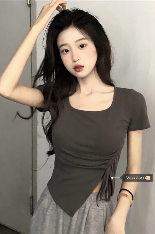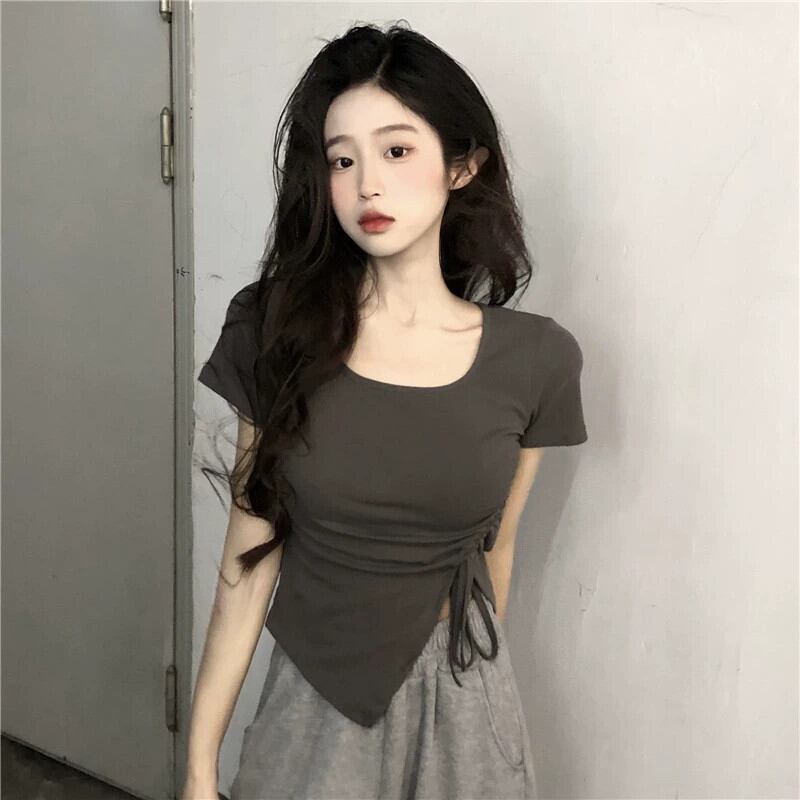 グレーフロントショルダー半袖Tシャツレディース夏デザインセンスニッチスイートイレギュラースリムフィットショートトップス 大人ガーリー スウィート キュート カジュアル サマー 夏物 8571682869889385