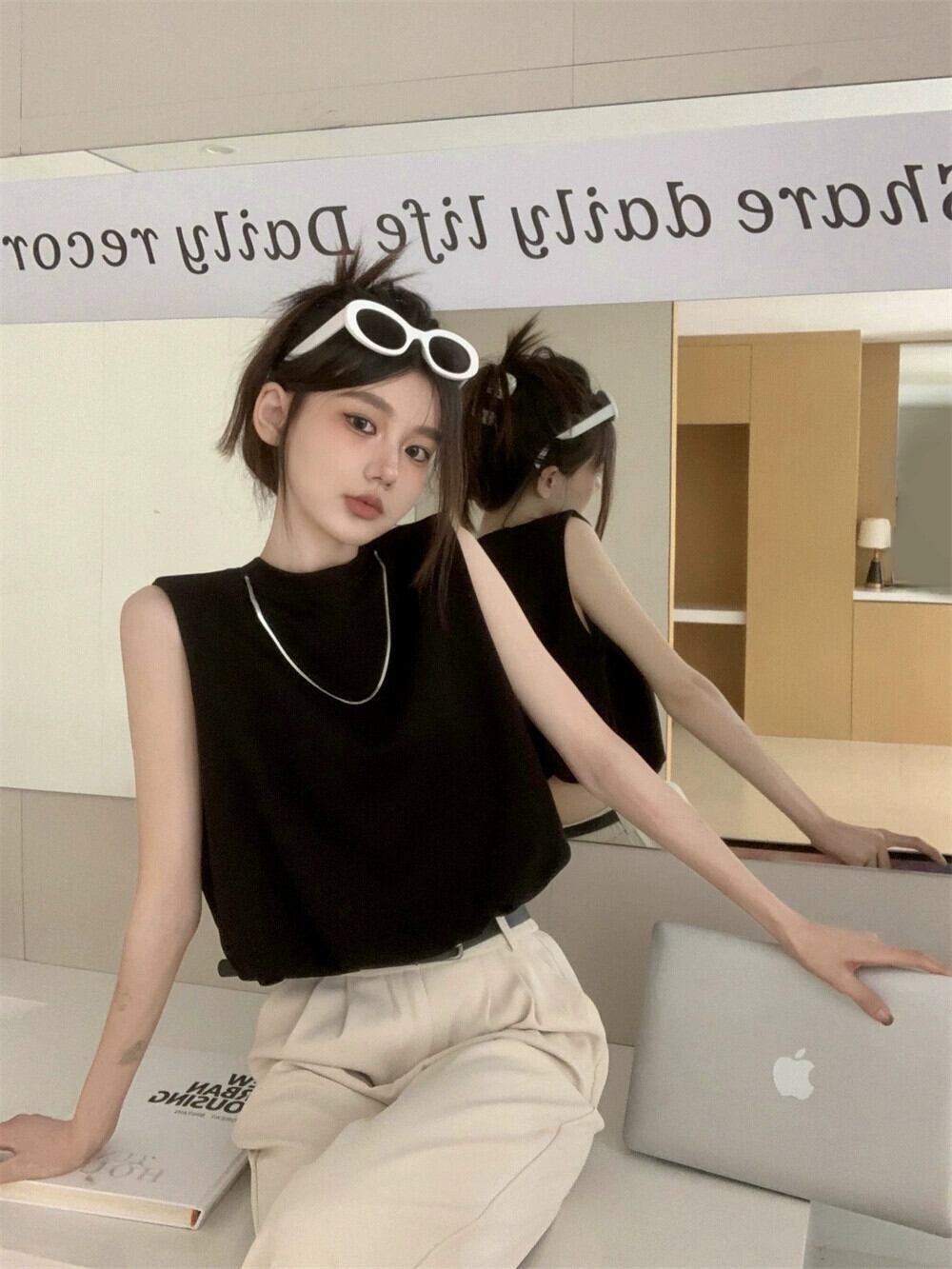 アプリコットカラーの肩パッドノースリーブ Tシャツレディース 2023 夏の新しいスタイルのソルトラインウェア小さいショートベストトップ レッド サマー 夏物 8571619202358557