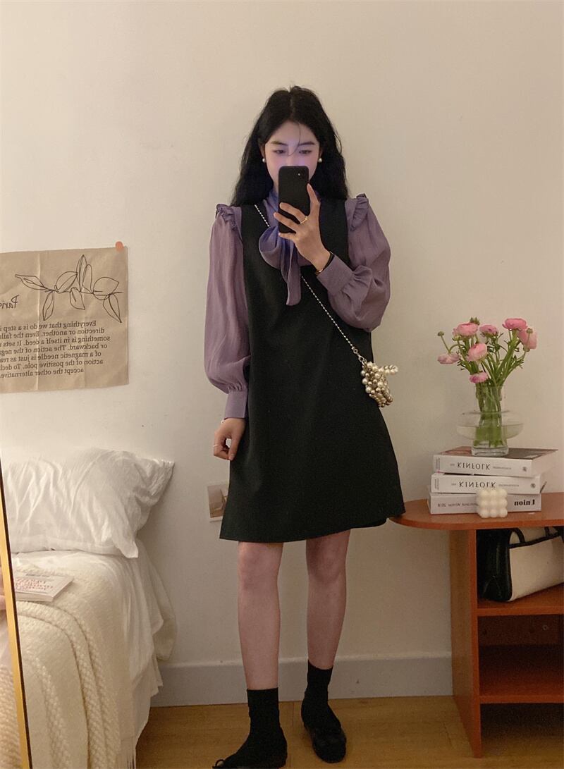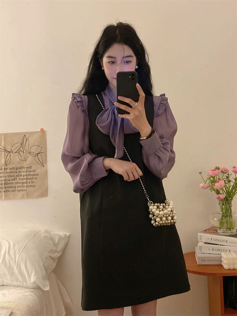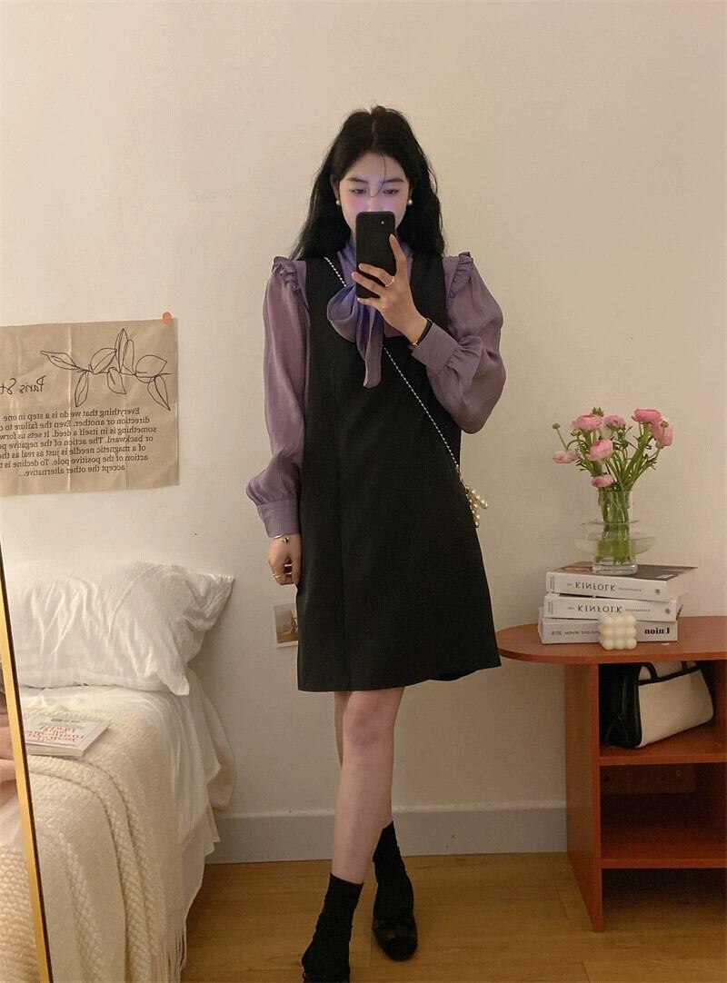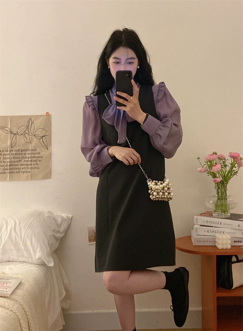 色:アプリコットシャツ,紫のシャツ,ブラックストラップドレス