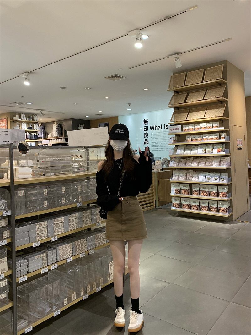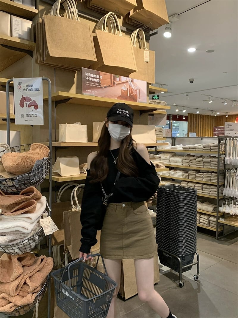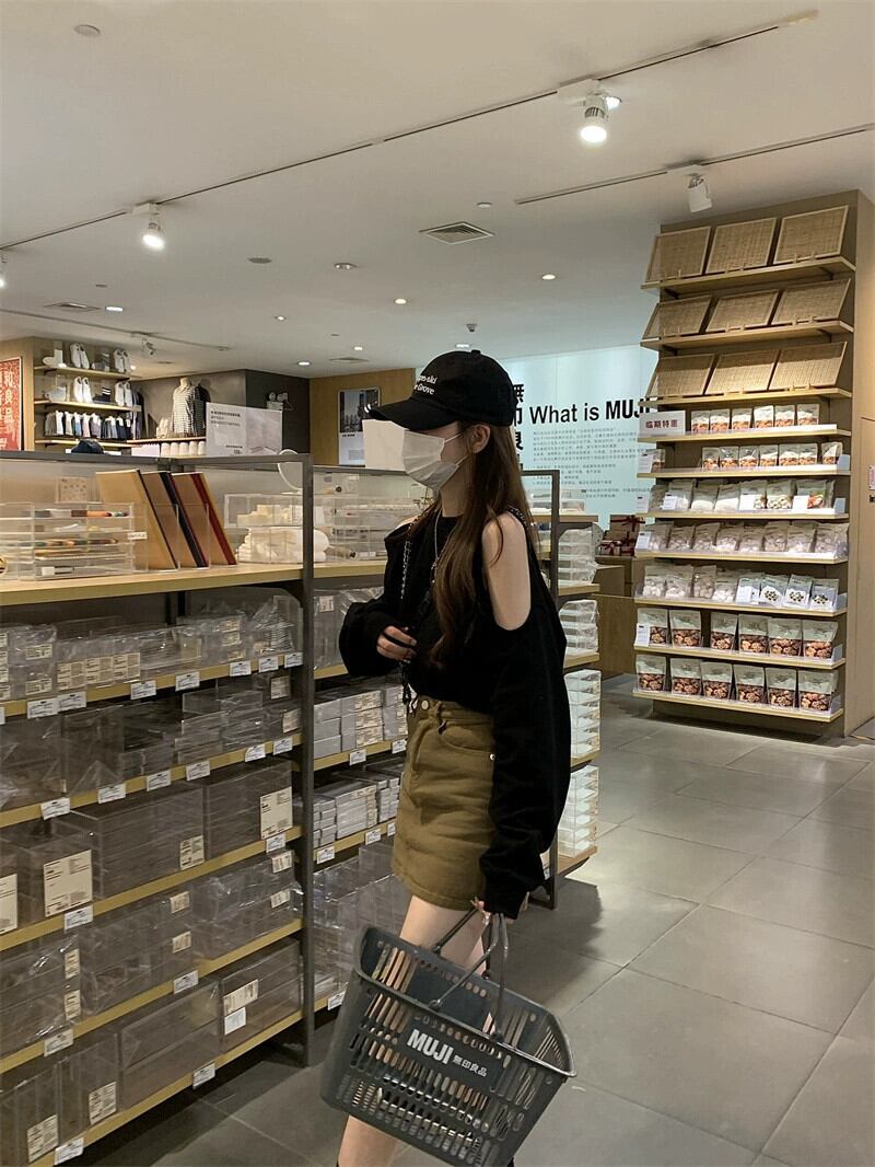 黒のストラップレス長袖 T シャツの女性の 2023 春の新しいデザインセンスニッチルーズシックな甘辛ショートトップス ロング ブラック 大人ガーリー スウィート キュート カジュアル スプリング 春物 Tシャツ 857162859579647
