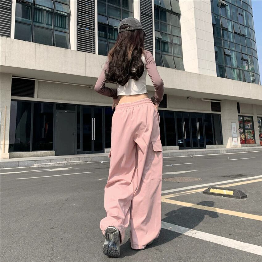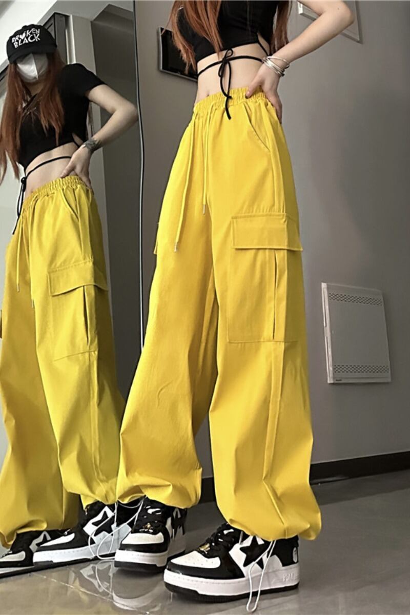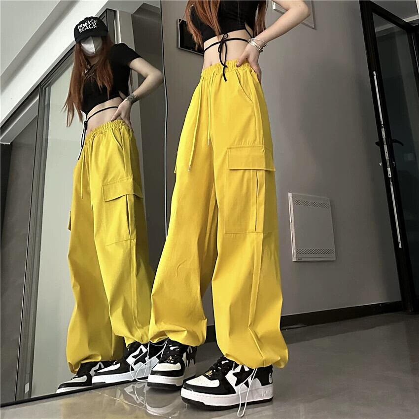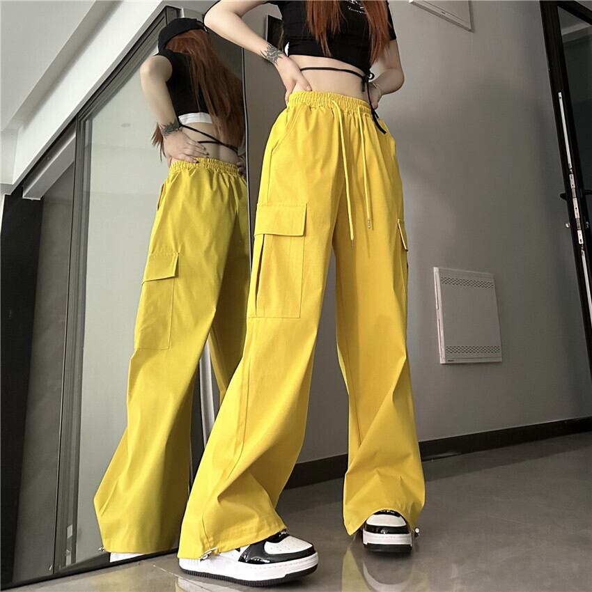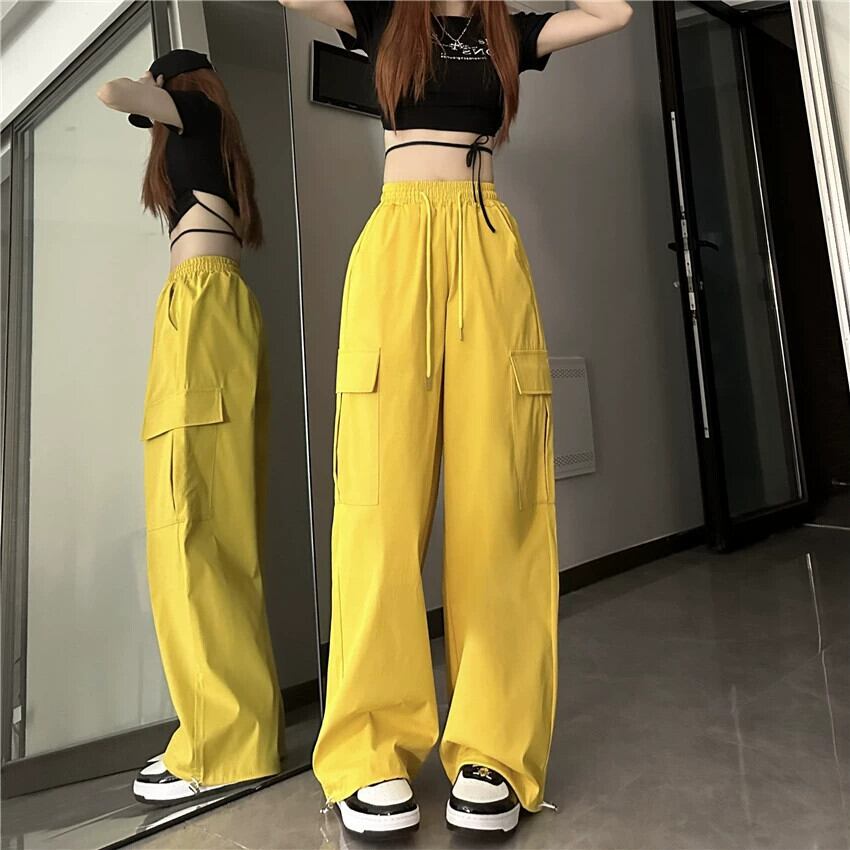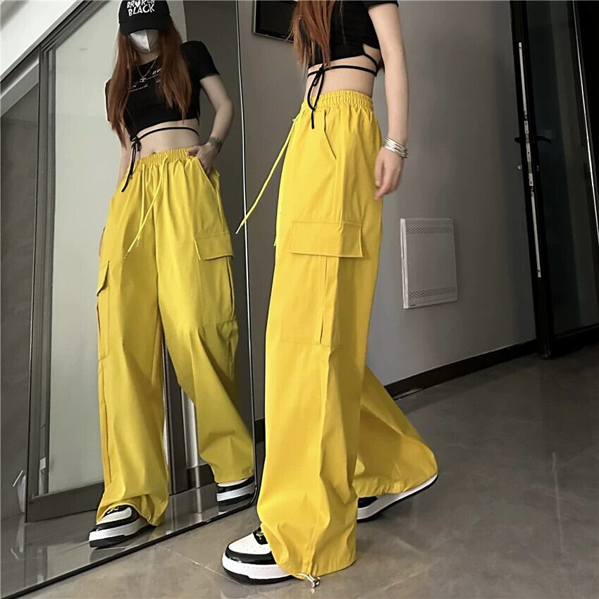 黄色のアメリカンスタイルのオーバーオールの女性の夏のルーズフィットパンツ 2023 新しいハイウエストオールマッチカジュアルワイドレッグ長ズボン ロング サマー 夏物 8571692916693714