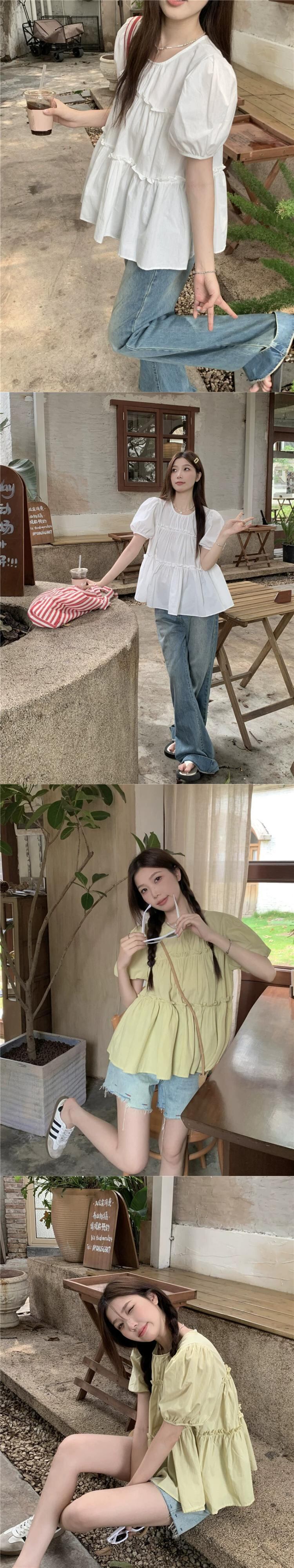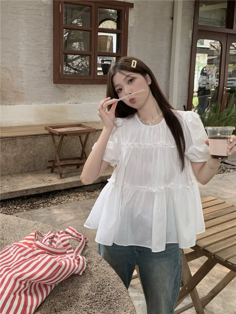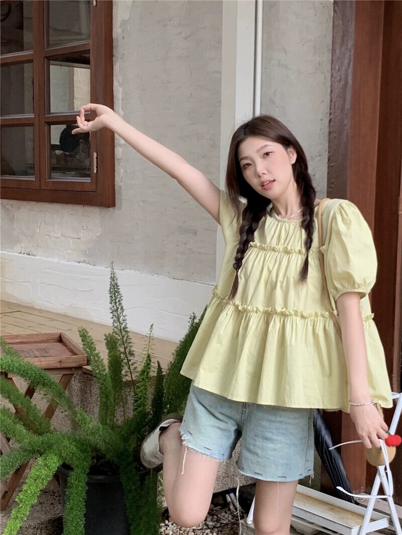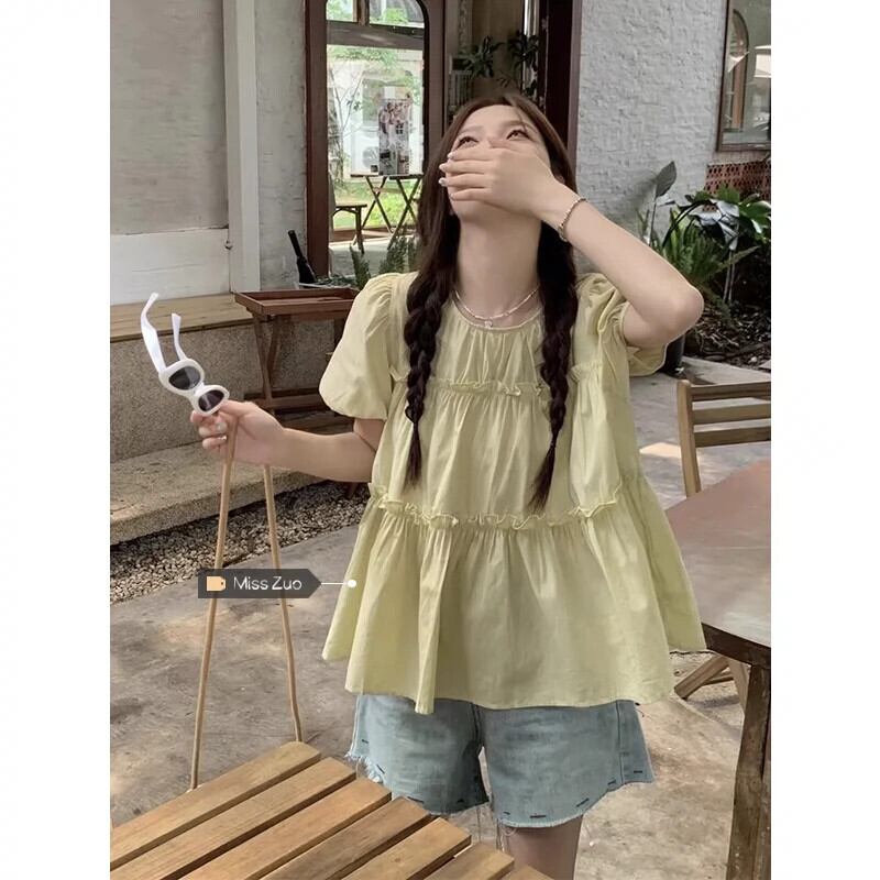 グリーンドールシャツトップ女性の夏の2023新しい甘くて優しい小さな男カバー腹パフスリーブシャツ 大人ガーリー スウィート キュート カジュアル サマー 夏物 8571642738064522