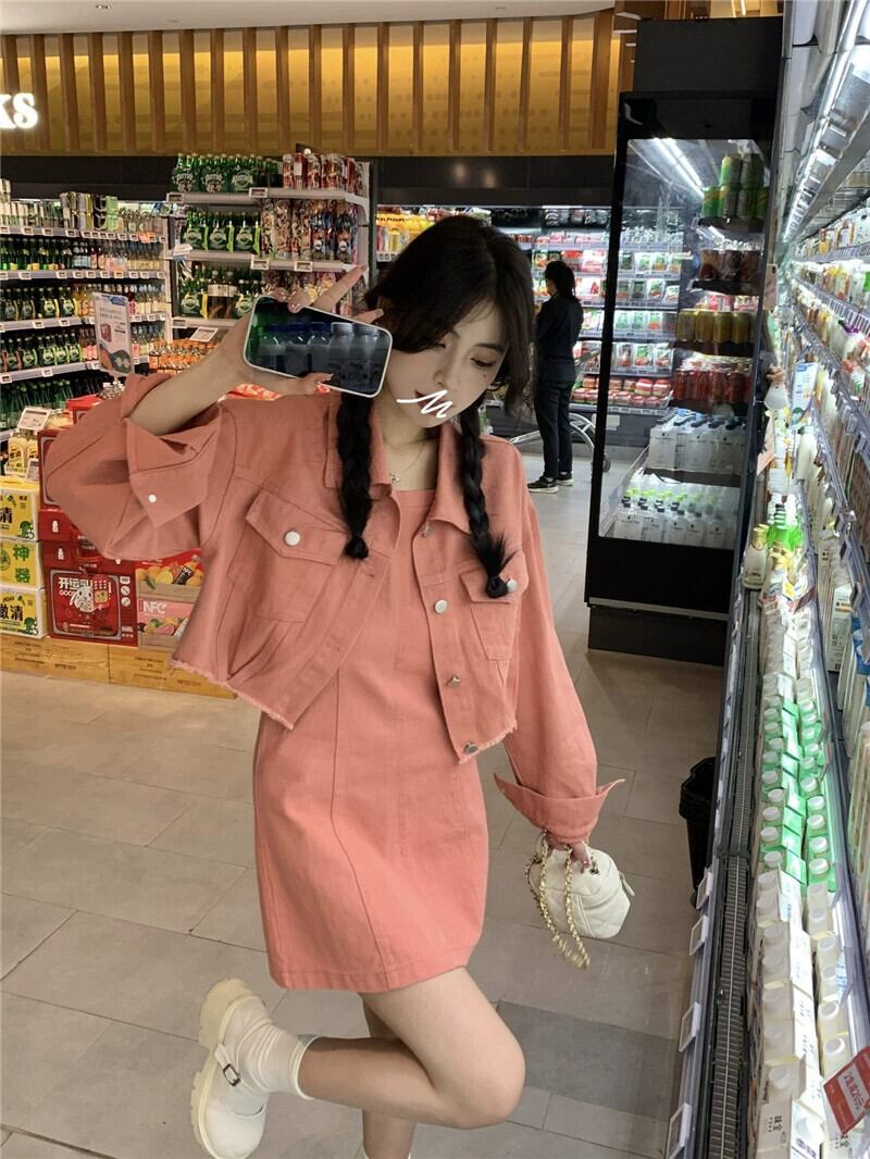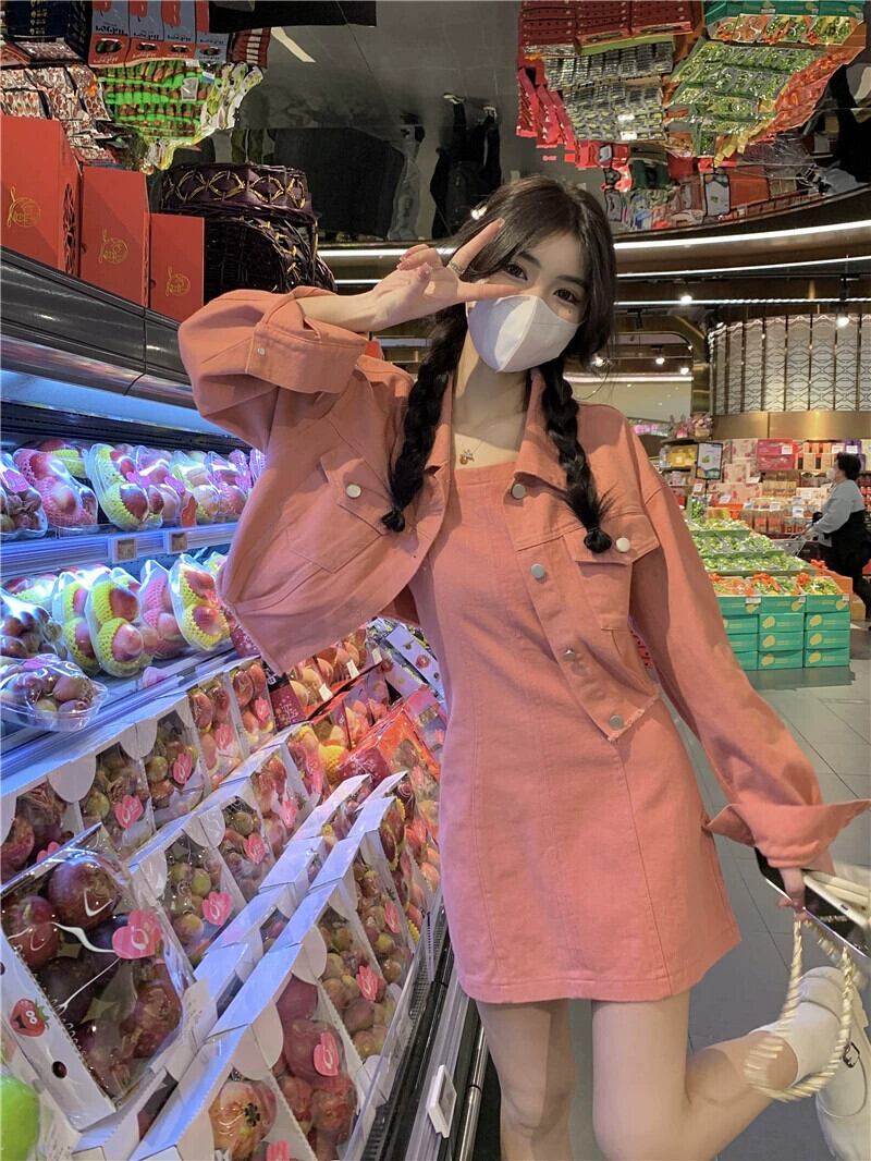 色:ミルクアプリコットサスペンダースカート,ピンクのジャケット,ミルクアプリコットコート,ピンクのサスペンダードレス