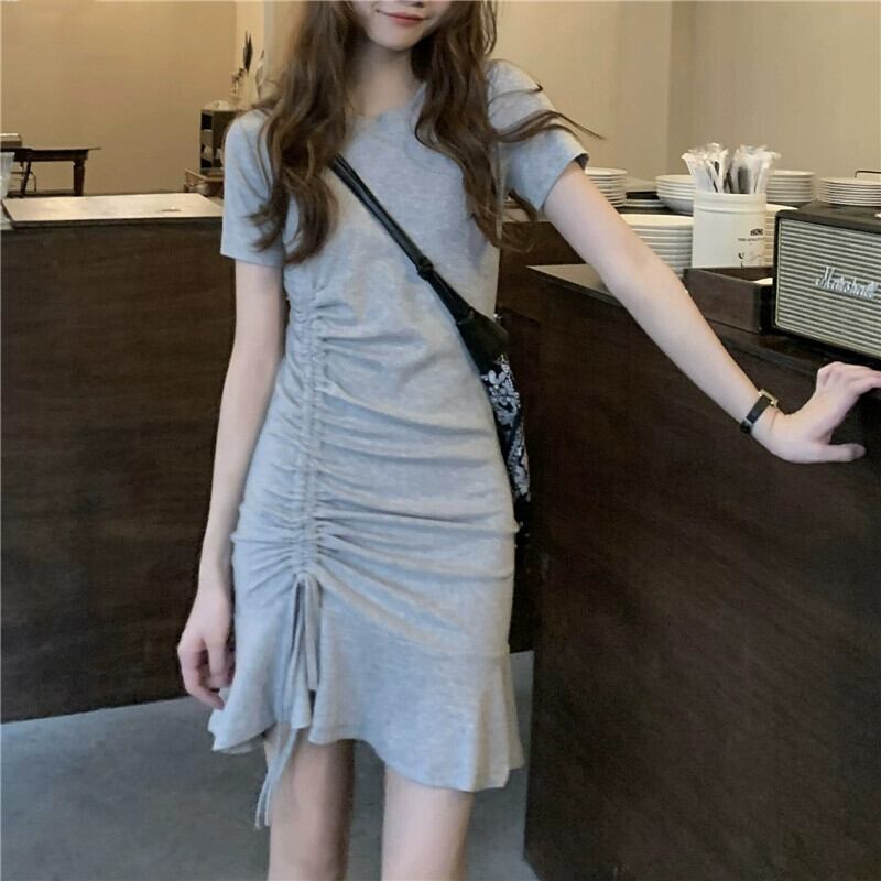 グレー半袖ドレスの女性の夏の 2023 新しいニッチデザインパッケージヒップスカートフリルフィッシュテールショートスカート サマー 夏物 857163461207896