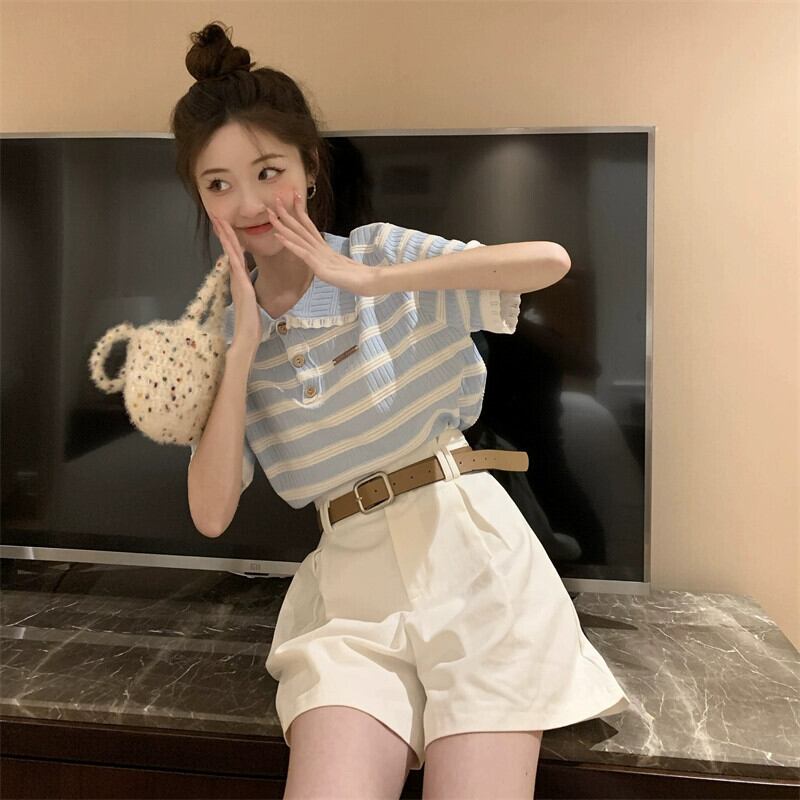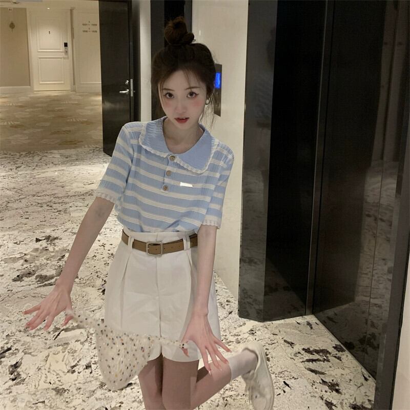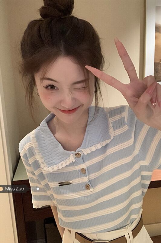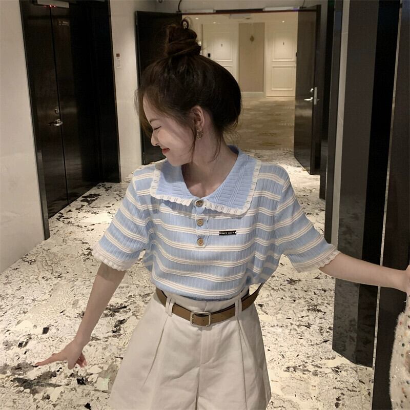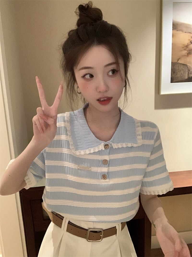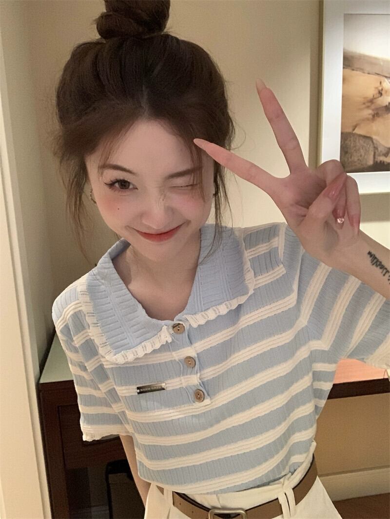 ブルーストライプ半袖Tシャツレディース夏デザインセンスニッチスイートスタイル優しいポロカラーショートトップス 大人ガーリー スウィート キュート カジュアル サマー 夏物 8571663565018419