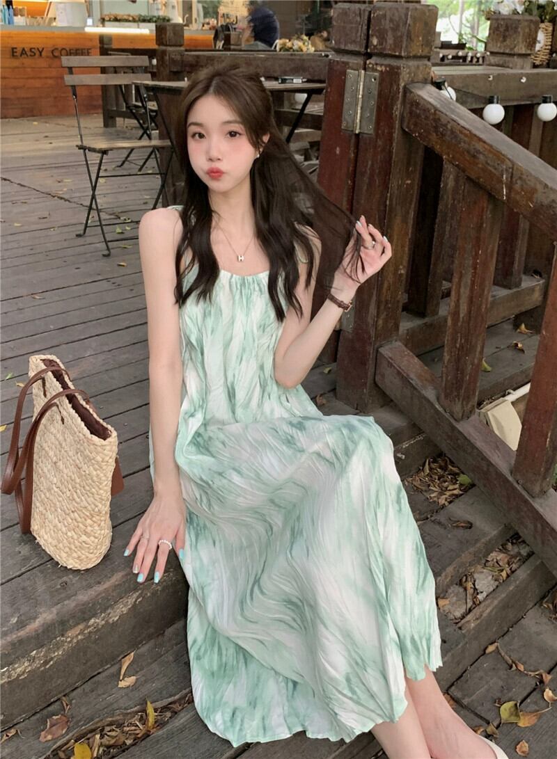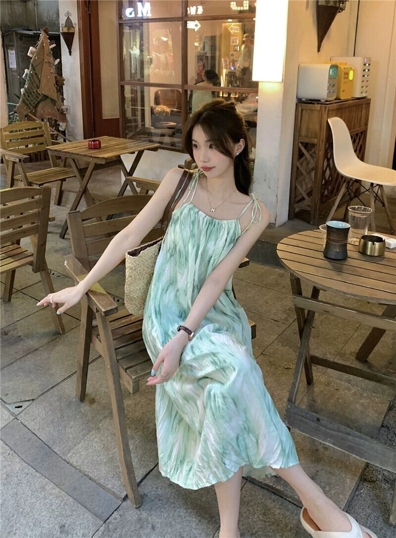 グリーンプリントスリングドレス女性の夏2023新しいフレンチスタイル穏やかな風海辺の休暇ビーチロングスカート サマー 夏物 8571627912047804