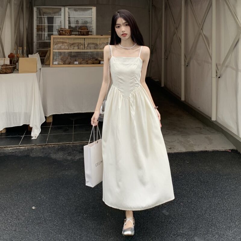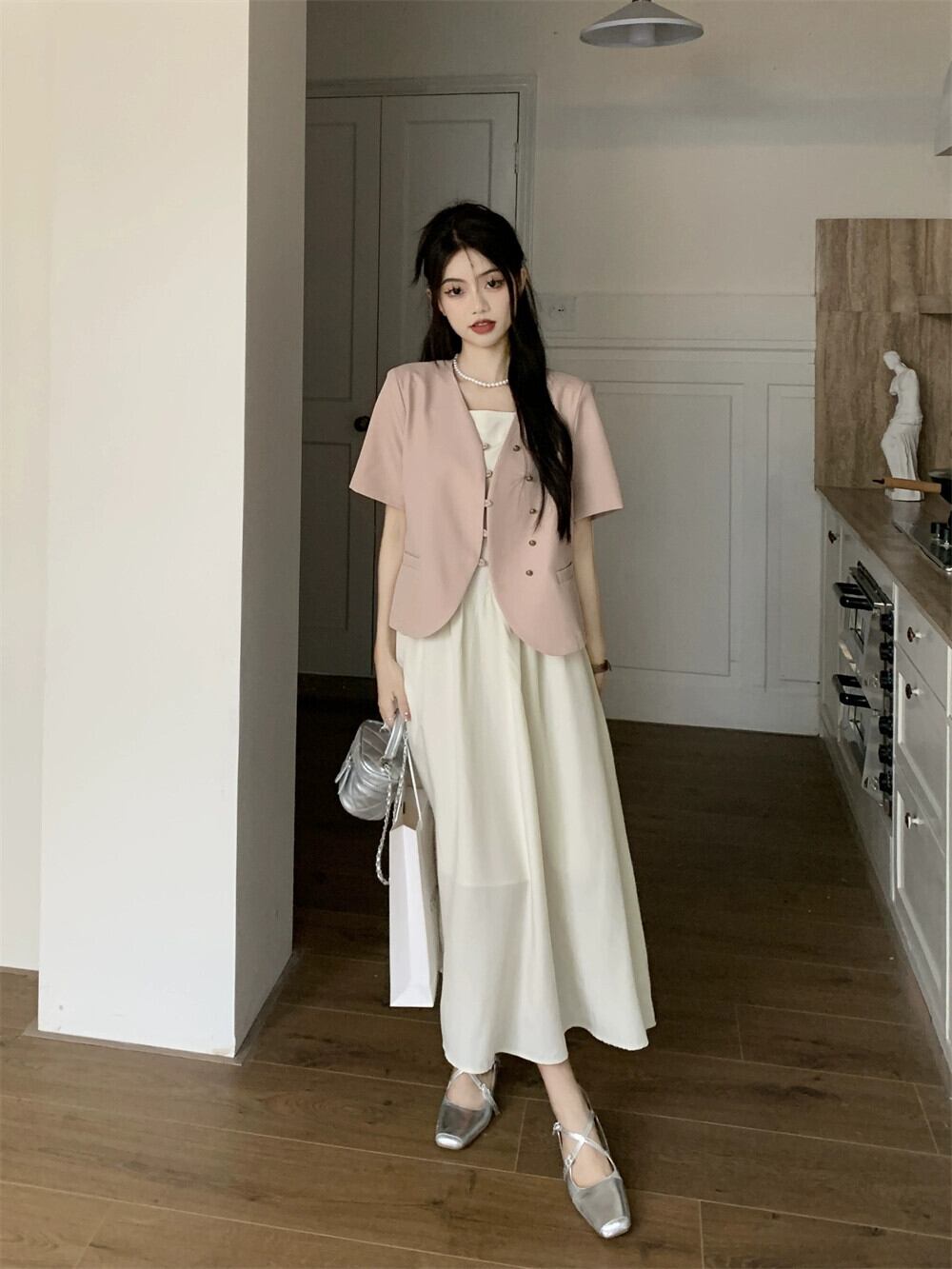 色:ピンクのカーディガン,白いドレス