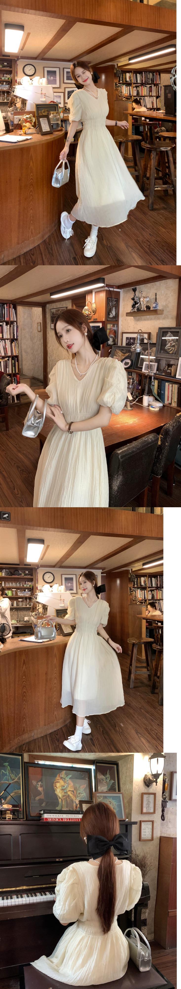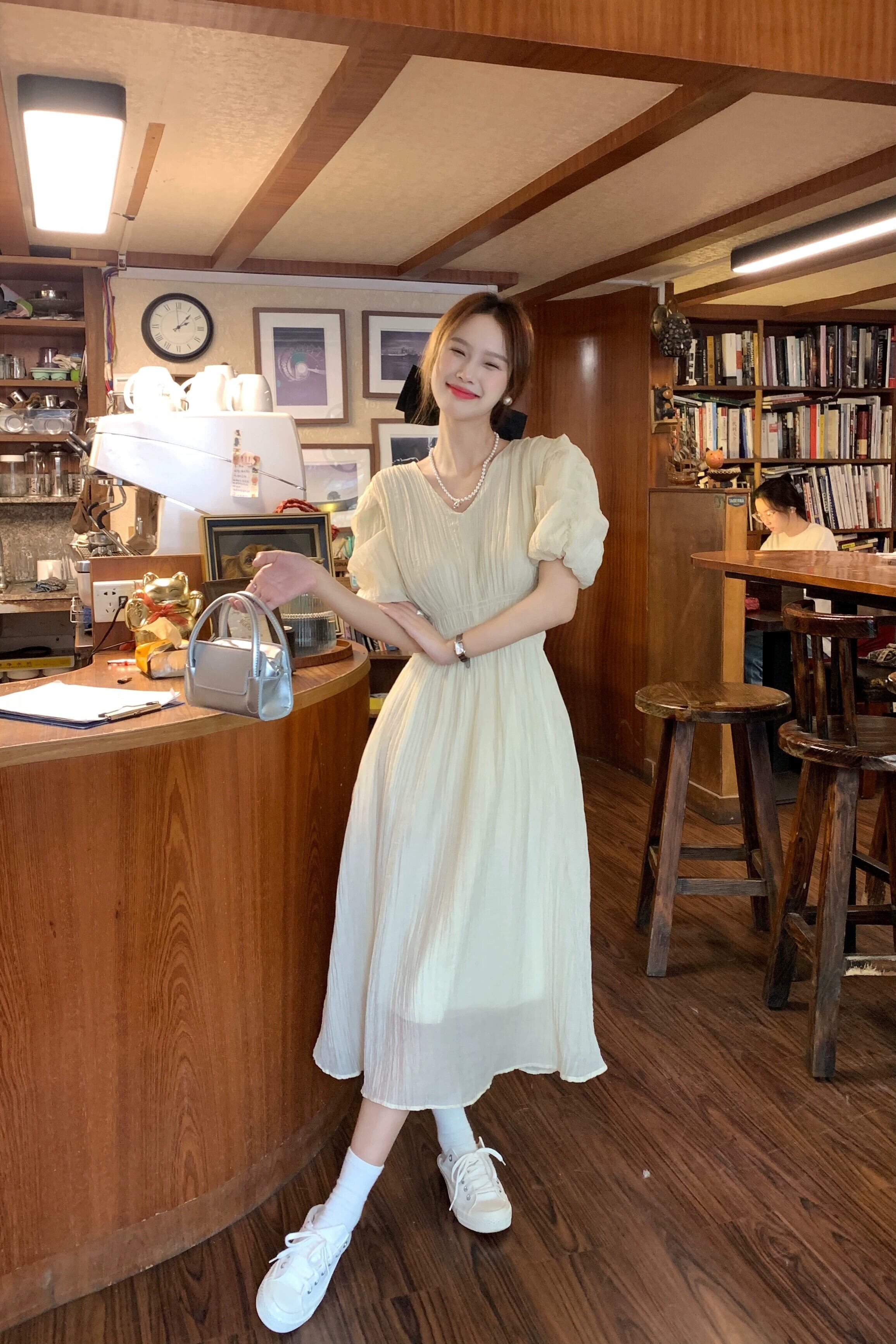 ピンクのパフスリーブドレスの女性の夏の 2023 新しいフレンチスタイルの優しい風初恋気質 V ネックロングスカート サマー 夏物 Vネック 8571649908972438