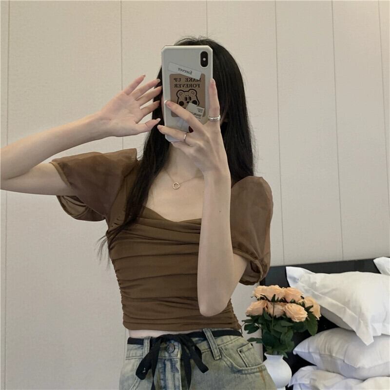 ブラックスクエアカラーショートトップレディース2023夏新作ピュアデザイアスリムスリムパフスリーブ半袖Tシャツ サマー 夏物 スクウェア 8571617072734118