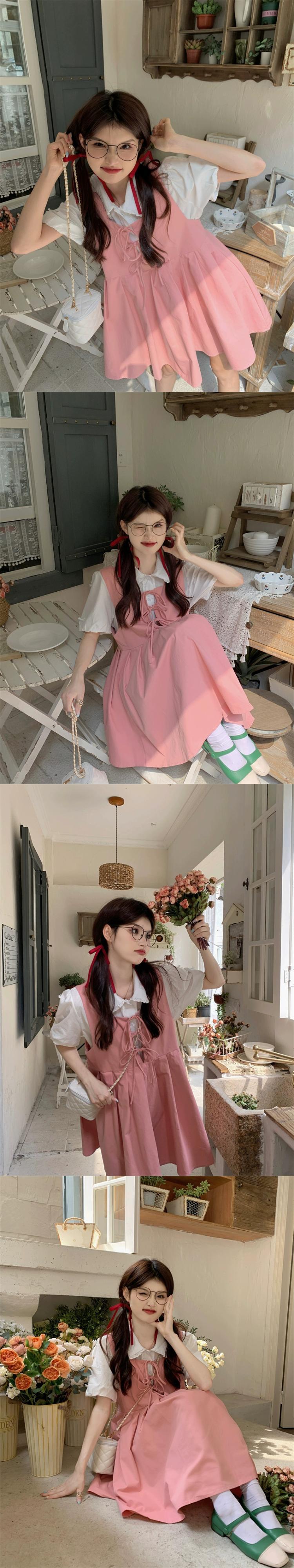 色:白のシャツ,「ピンクのサンドレス」,フルーツグリーンタンクスカート